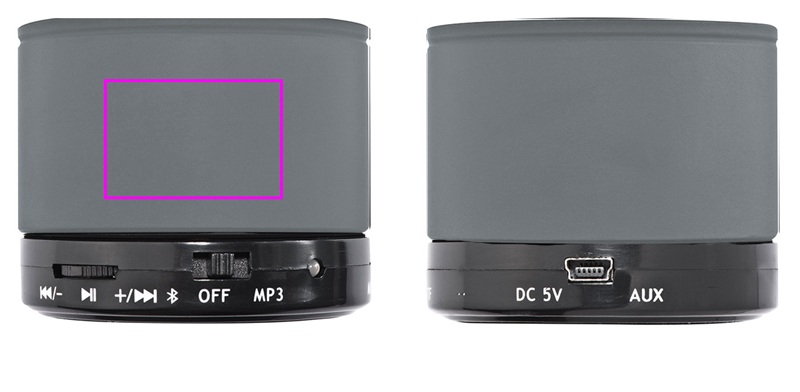Мини-колонка Bluetooth с USB-портом для зарядки, радиус действия до 10 метров, время зарядки около 2 часов и время работы до 1,5 часов. Ваш логотип будет нанесен лазером на колонку.