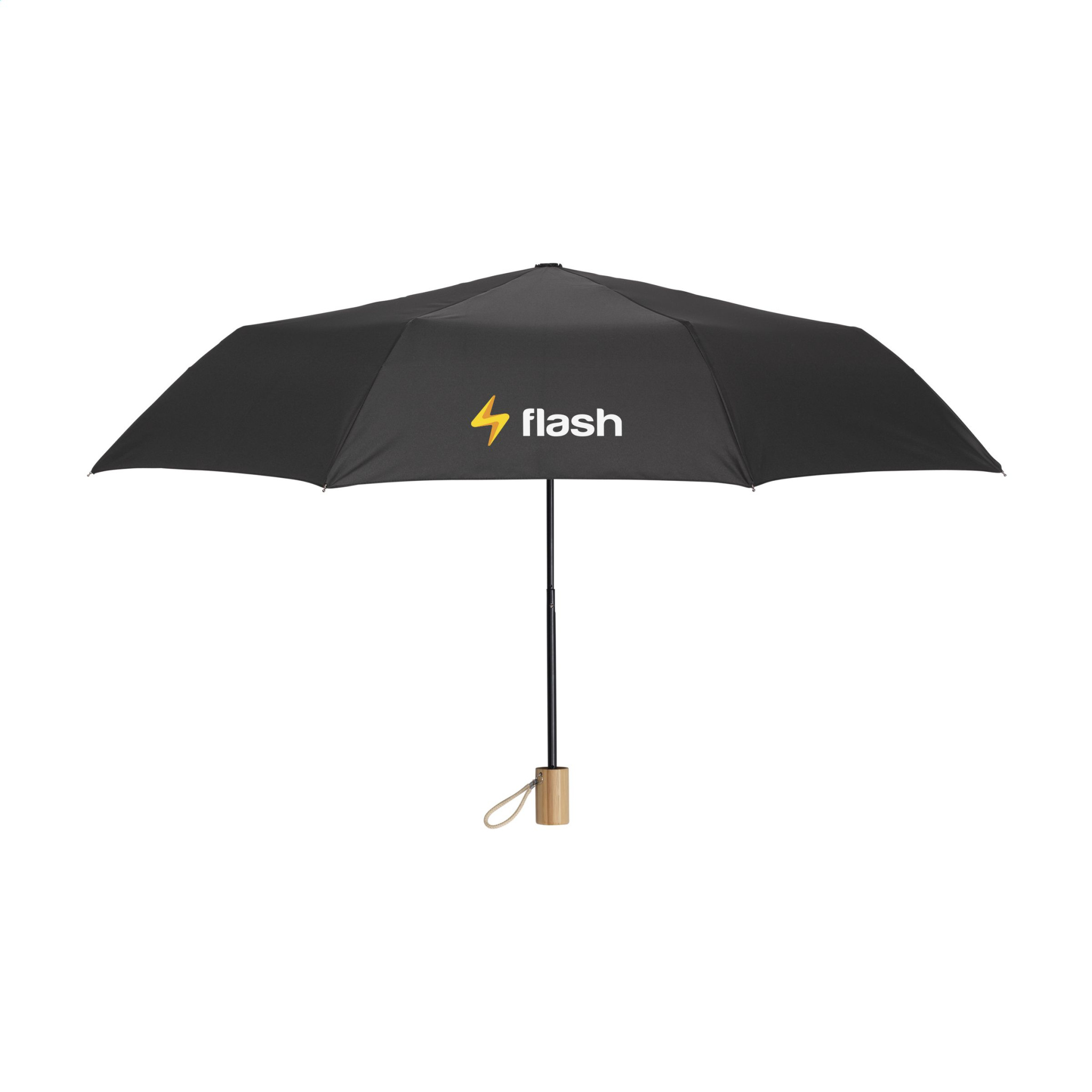 WoW! Складной зонт из полиэстера RPET 190T. С древком и рамой из нержавеющей стали, красивой бамбуковой ручкой с хлопковой петлей, застежкой-липучкой, чехлом для хранения и этикеткой RPET. Ручное управление. Сертифицировано RCS. Общее количество переработанного материала: 18%.