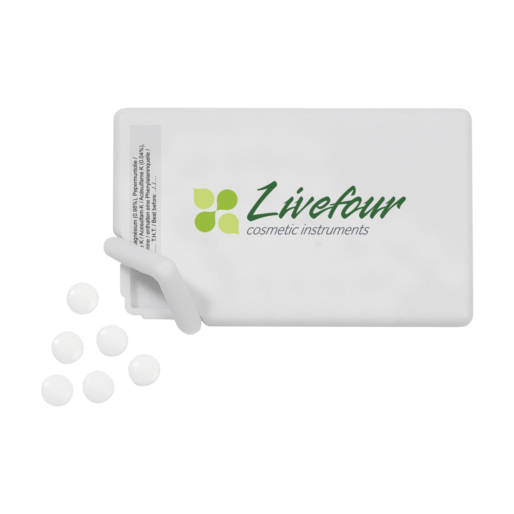 Диспенсер с примерно 8 г (50 штук) мятных леденцов без сахара.