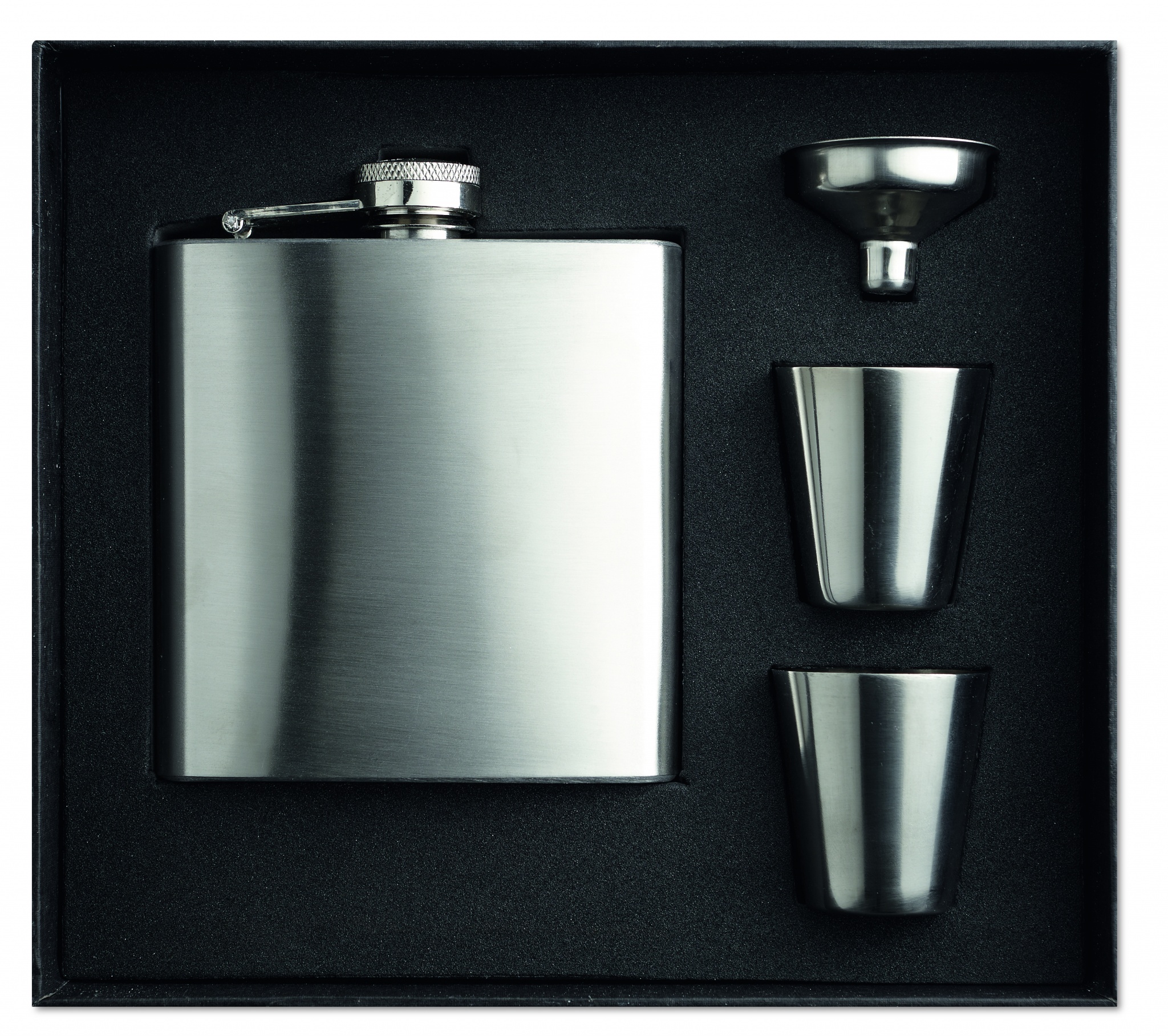 Фляга 175 мл, 2 рюмки и воронка. Нержавеющая сталь, подарочная картонная упаковка.