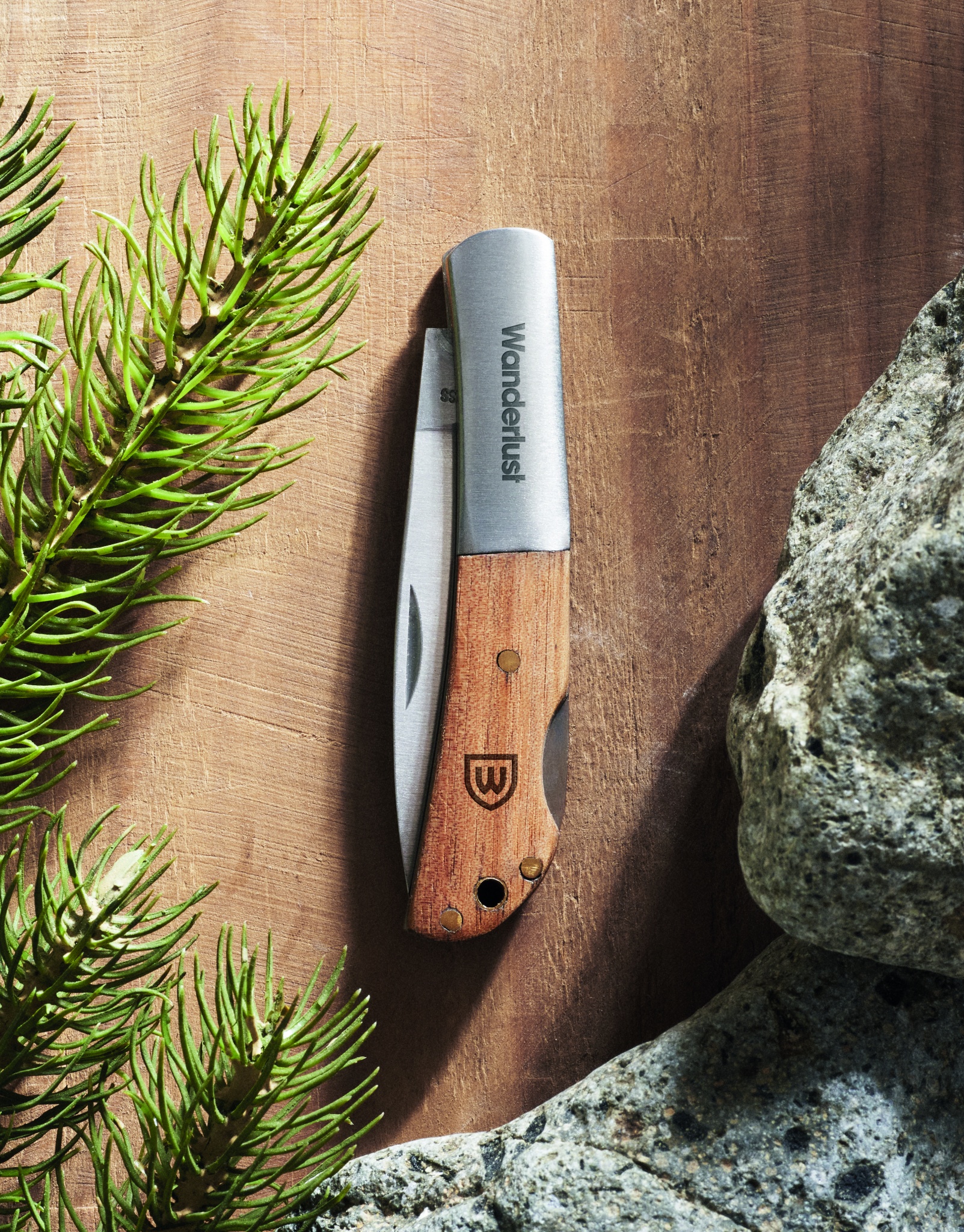 Складной нож из нержавеющей стали с деревянной ручкой из акации. Длина лезвия: 6 см.