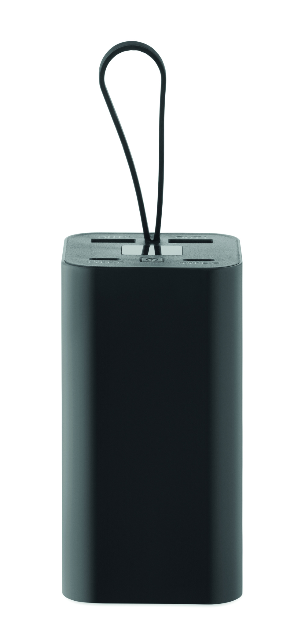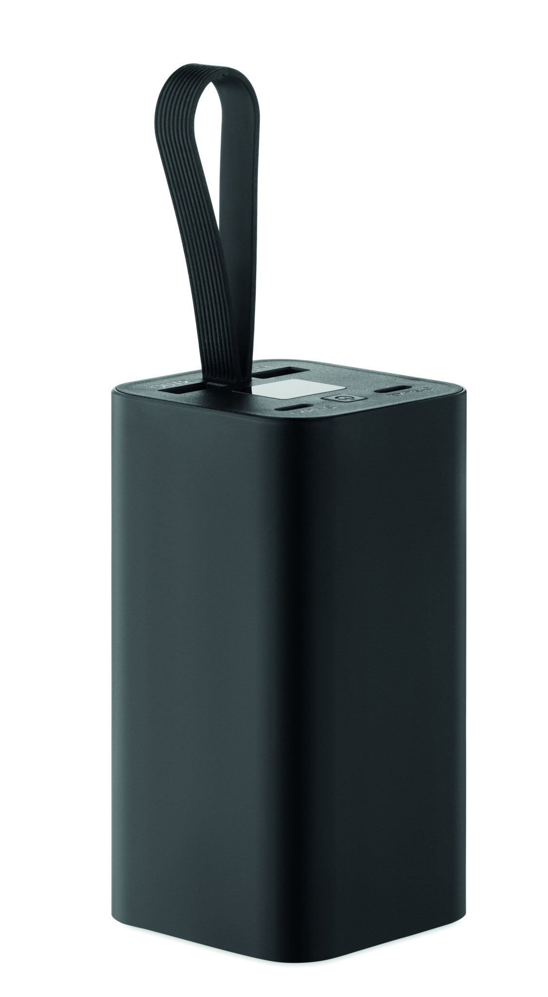 20.000 mAh power bank made of recycled aluminium with a digital power display and silicone hanger. Features two Type-C and two USB-A outputs with PD 65W fast charging.