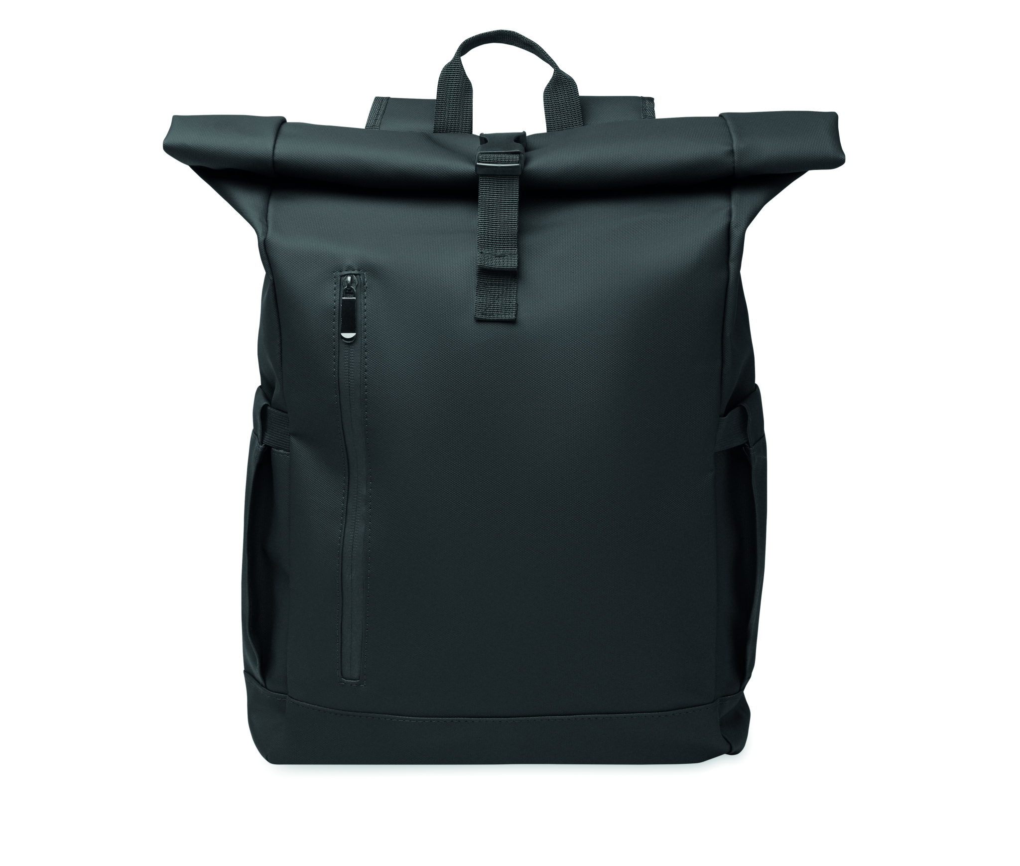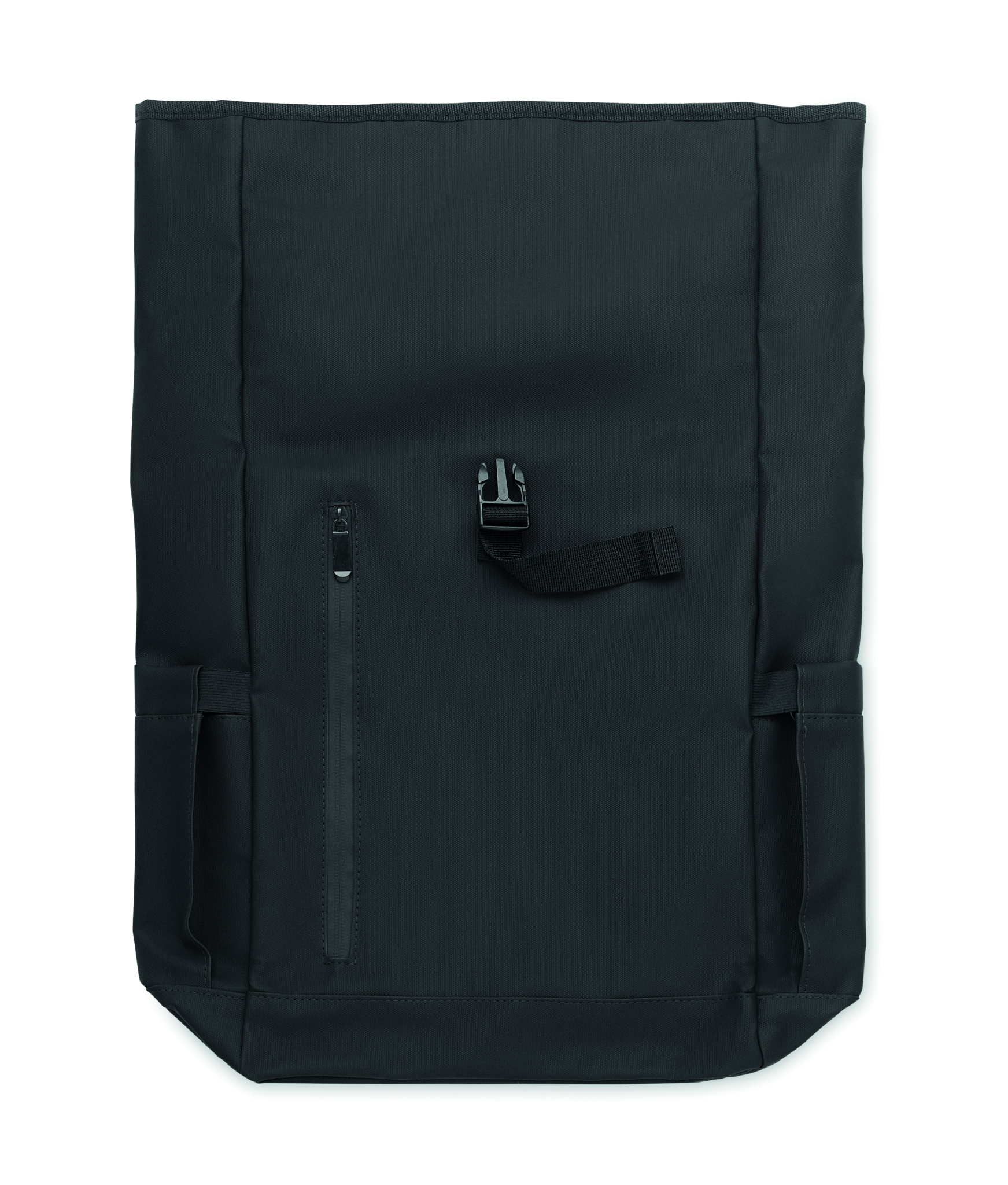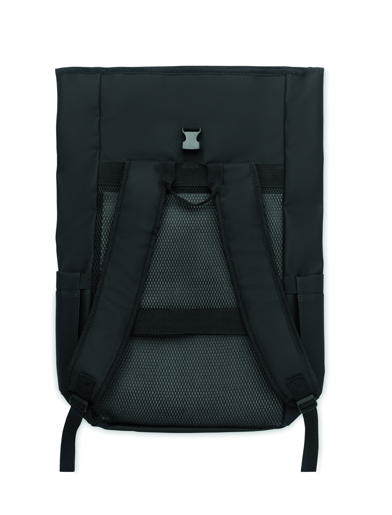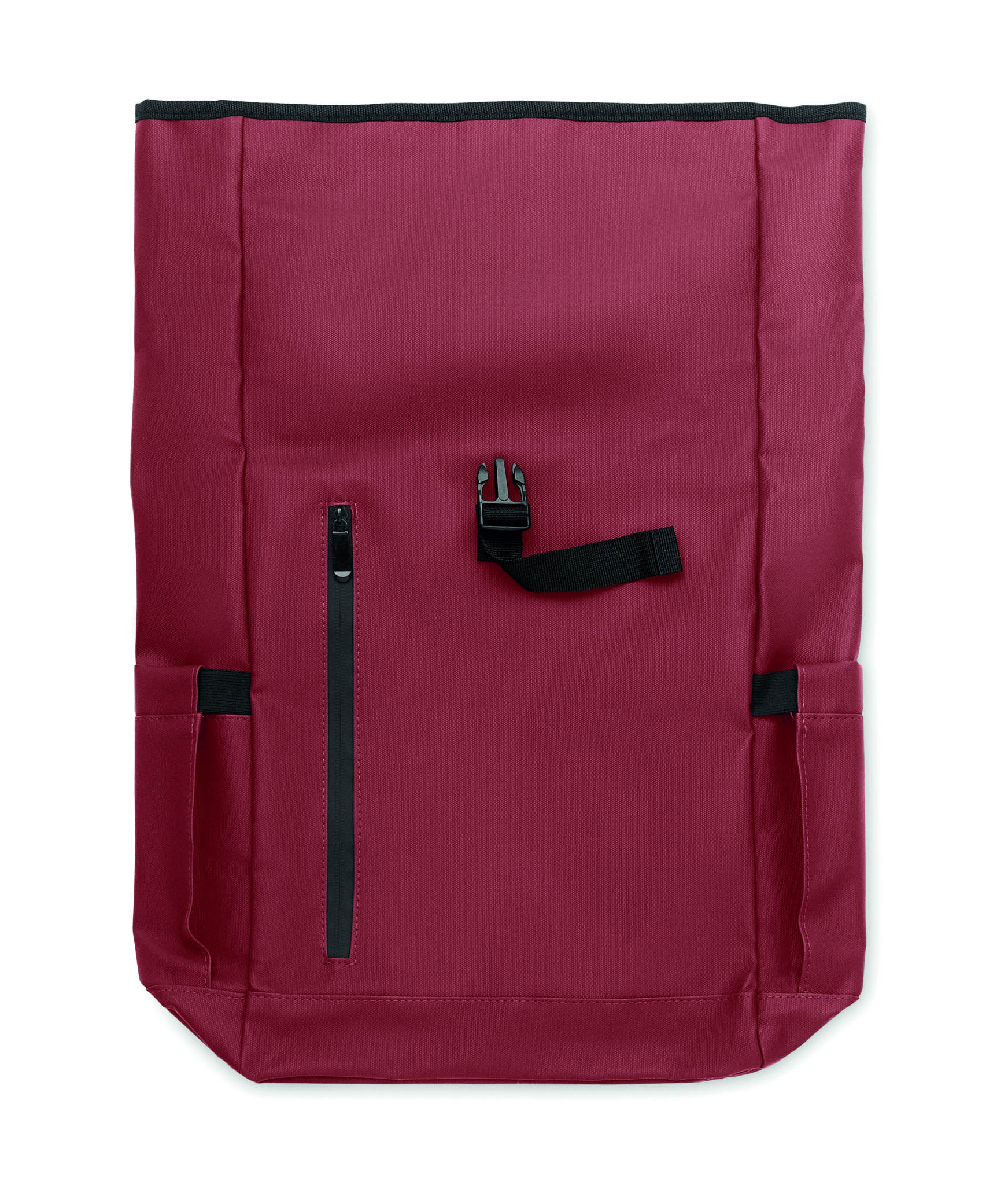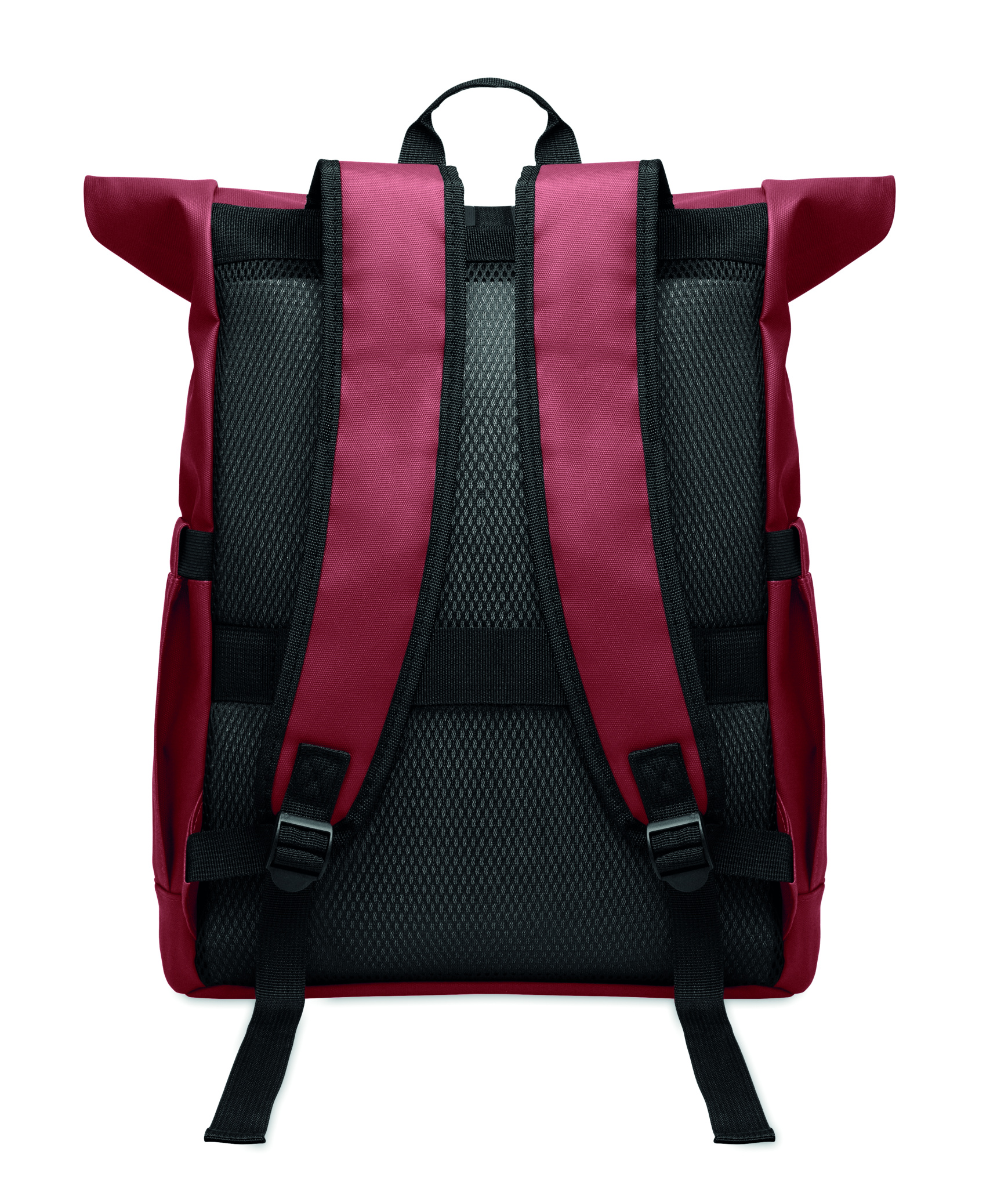 Roll top 15 inch laptop backpack in PU coated 600D RPET polyester and RPET polyester lining. Meshed padded back with zippered pocket and trolley strap. Padded shoulder strap with mesh inside finishing.