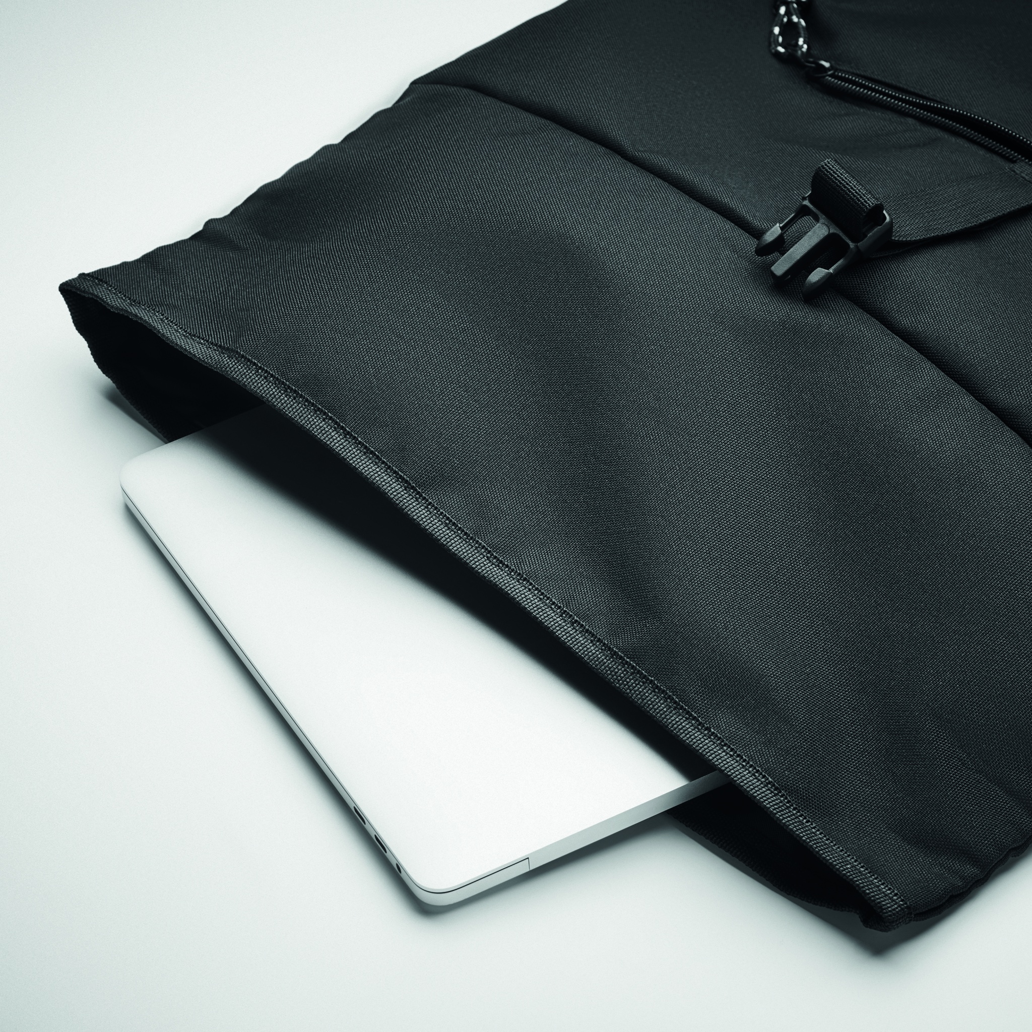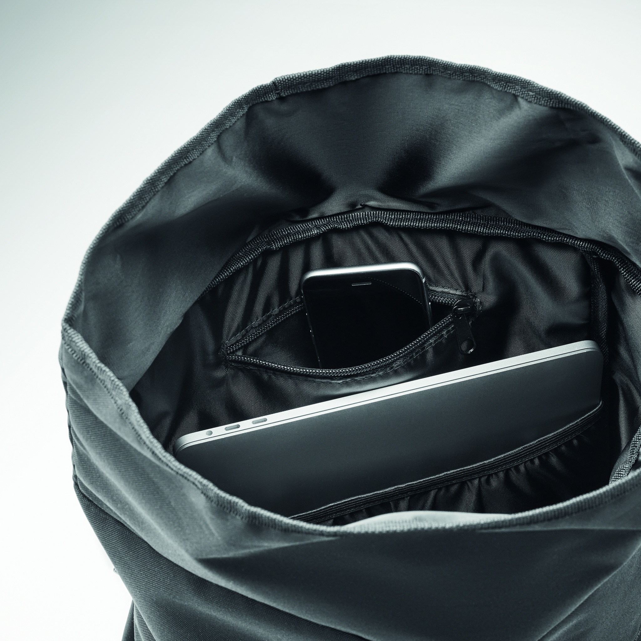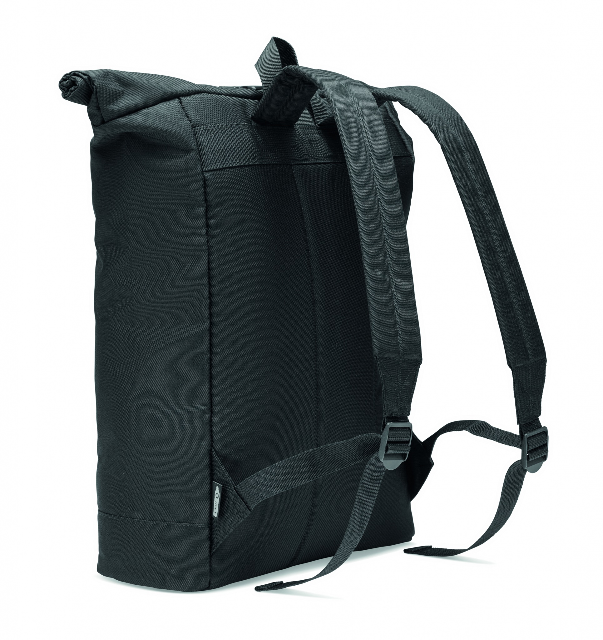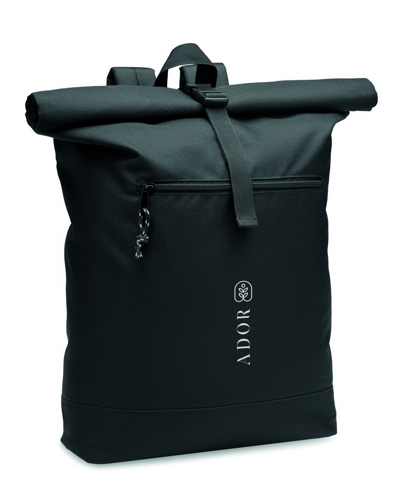 Рюкзак с застежкой Rolltop из полиэстера 600D RPET с мягкой спинкой и усиленным дном. Передний карман на молнии. Подкладка из 210D RPET.