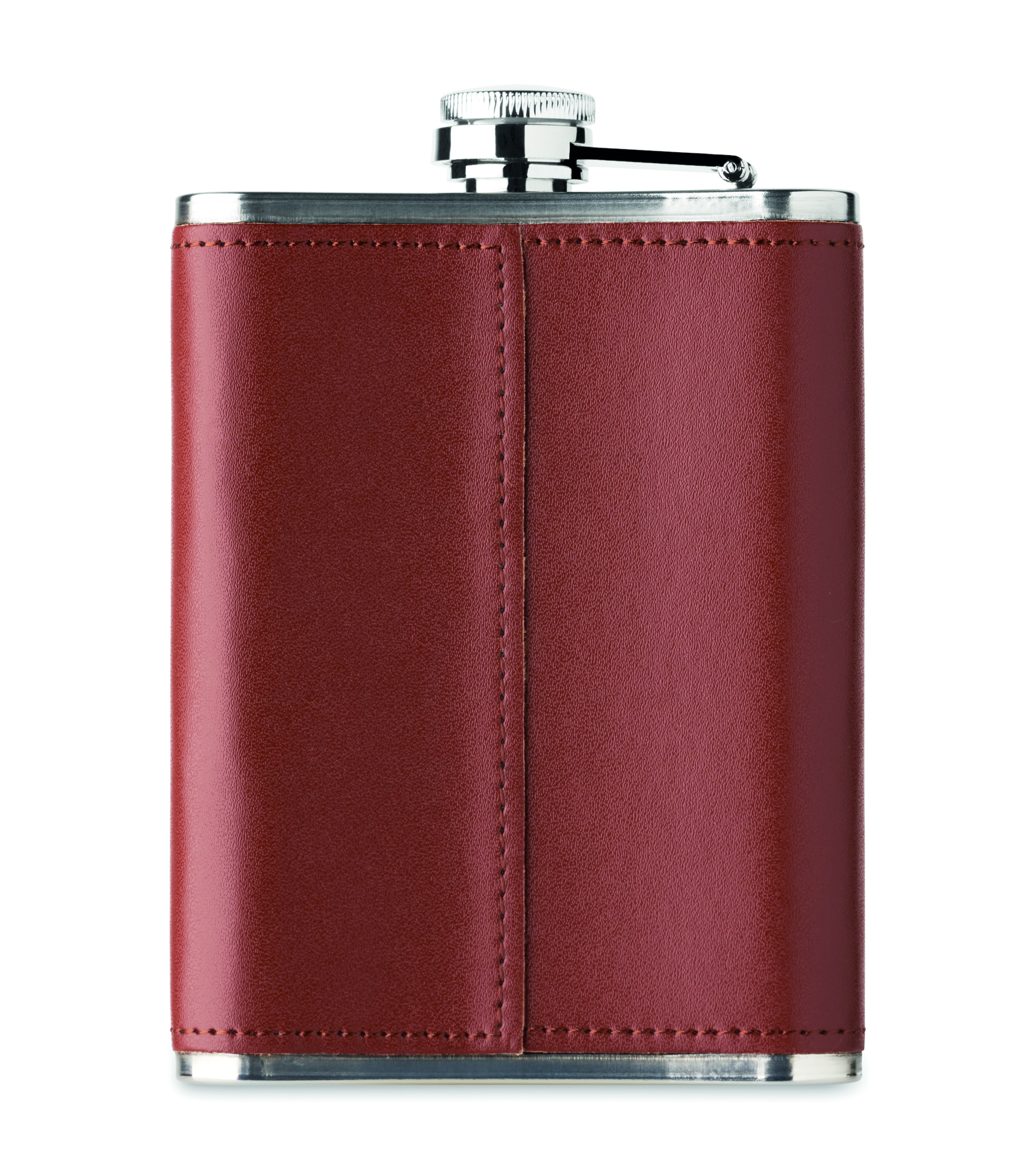 Slim hip flask in stainless steel with PU-leather cover. 200 ml capacity.