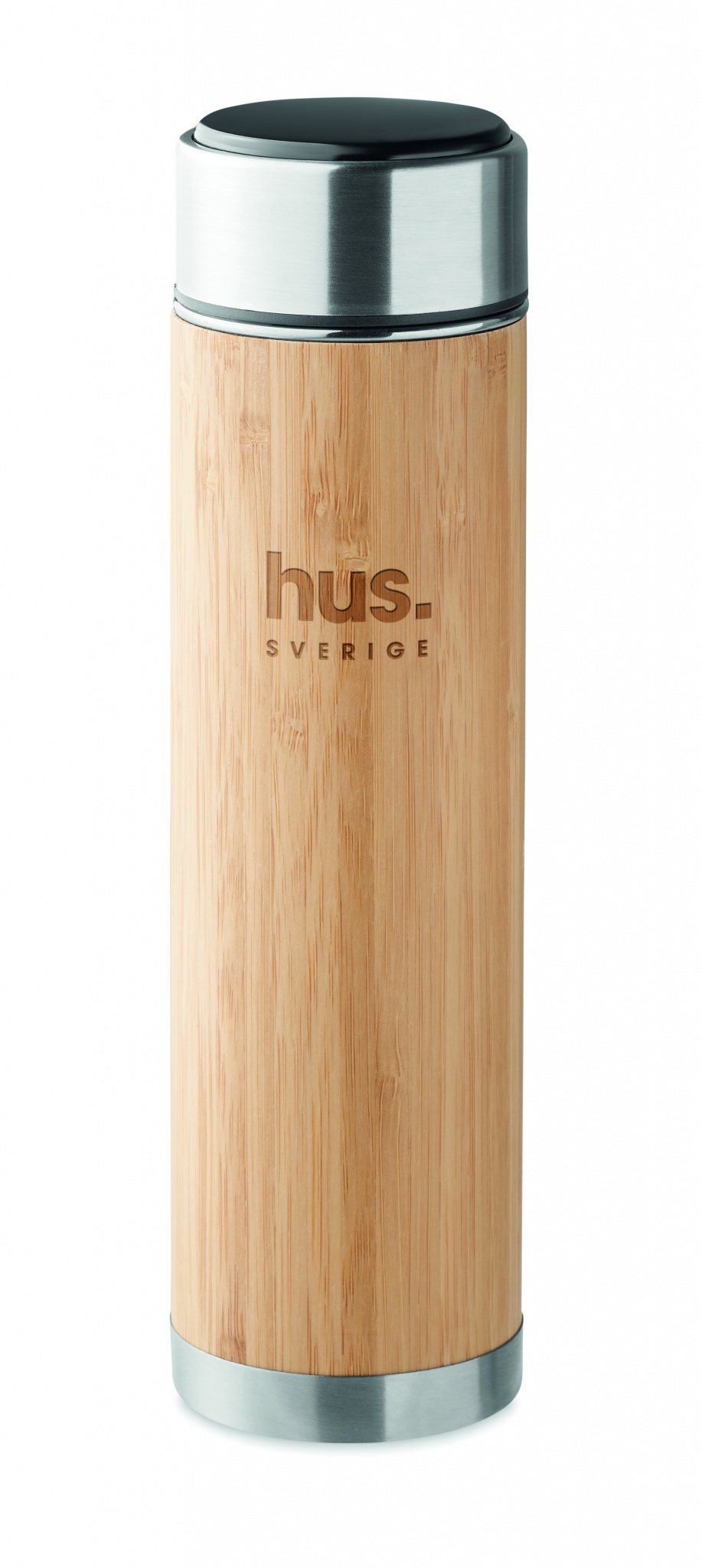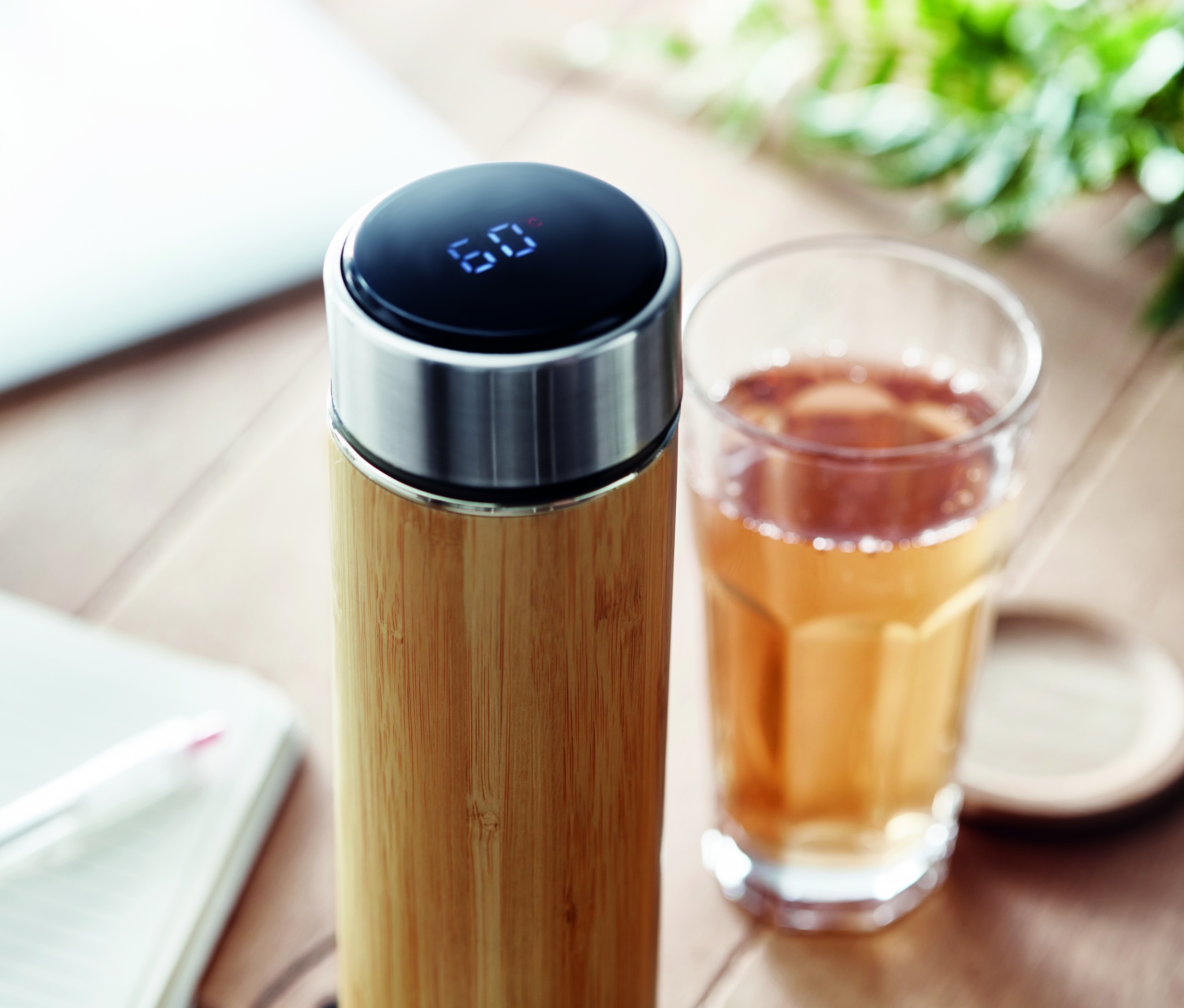 Термос с двойными стенками из нержавеющей стали и бамбука с заварочным ситечком. В крышке встроен термометр. В комплект входит 1 сменная батарея CR2032. Емкость: 480 мл. Полностью герметичен