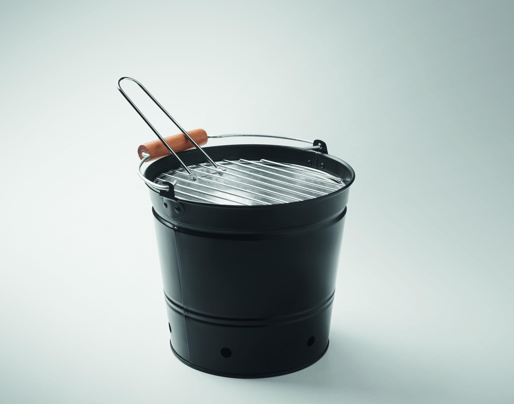 Железное ведерко для барбекю с грилем из нержавеющей стали и деревянной ручкой.