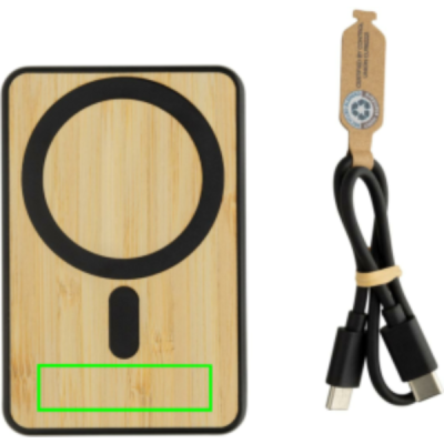 Карманный внешний аккумулятор емкостью 5000 мАч с магнитным беспроводным зарядным устройством 5 Вт с корпусом из сертифицированного RCS переработанного АБС-пластика и сертифицированного FSC бамбука. RCS (стандарт утверждения о переработке) — это стандарт для проверки содержания переработанных материалов в продукте по всей цепочке поставок. Общее содержание переработанных материалов: 22 % от общего веса товара. Внешний аккумулятор содержит долговечный литий-полимерный аккумулятор класса А емкостью 5000 мАч. Со встроенной подставкой для телефона. Индикаторы питания покажут оставшийся уровень энергии, поэтому вы всегда будете знать, когда следует подзарядить.; Вход Type-C 5 В/2,4 А; Выход Type C: 5 В/2 А,4 А. Товар и аксессуары не содержат ПВХ. В комплект входит сертифицированный RCS переработанный кабель для зарядки TPE. Упаковано в упаковку FSC® mix.