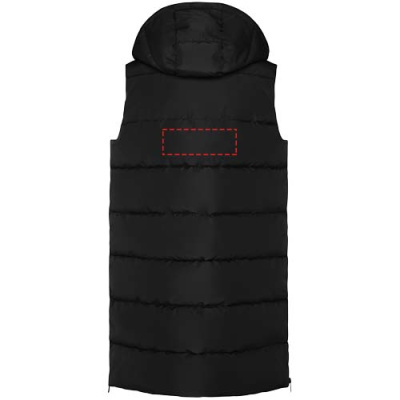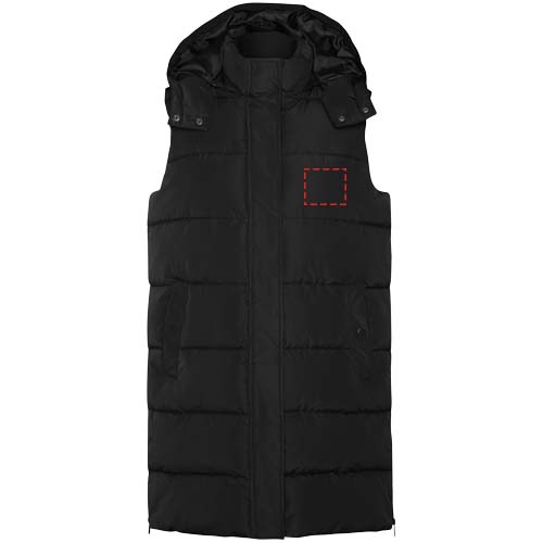 Мягкий утеплитель со съемным капюшоном. Высокий воротник. Передняя застежка-молния скрыта заслонкой. Два кармана с застежкой на кнопку. Боковые отверстия на молниях. Внутренний доступ к груди. Водоотталкивающая.