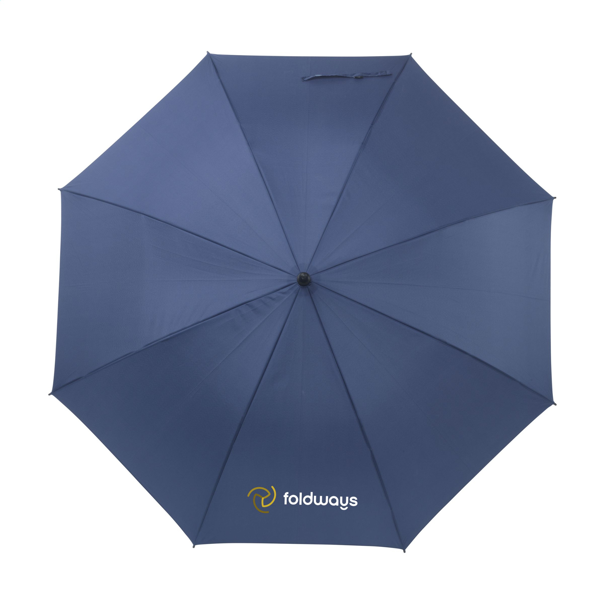 WoW! Зонт из эпонжа RPET 190T (изготовлен из переработанных ПЭТ-бутылок) с очень большим диаметром экрана 132 см. Характеристики включают автоматическую телескопическую подвеску для легкого открытия, стекловолоконный каркас и стебель, мягкую ручку из пенопласта, застежку-липучку и водоотталкивающее покрытие. Сертифицирован RCS. Общее количество переработанных материалов: 18%.