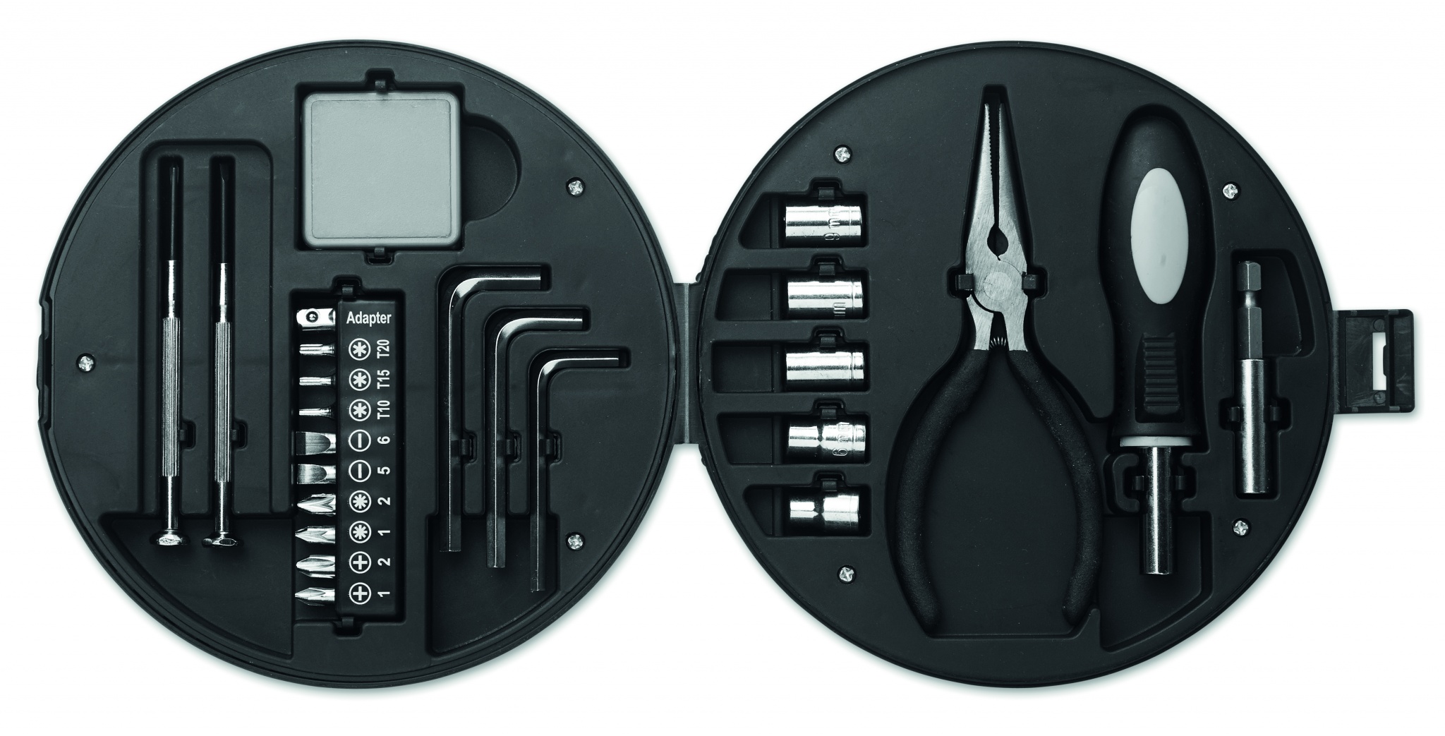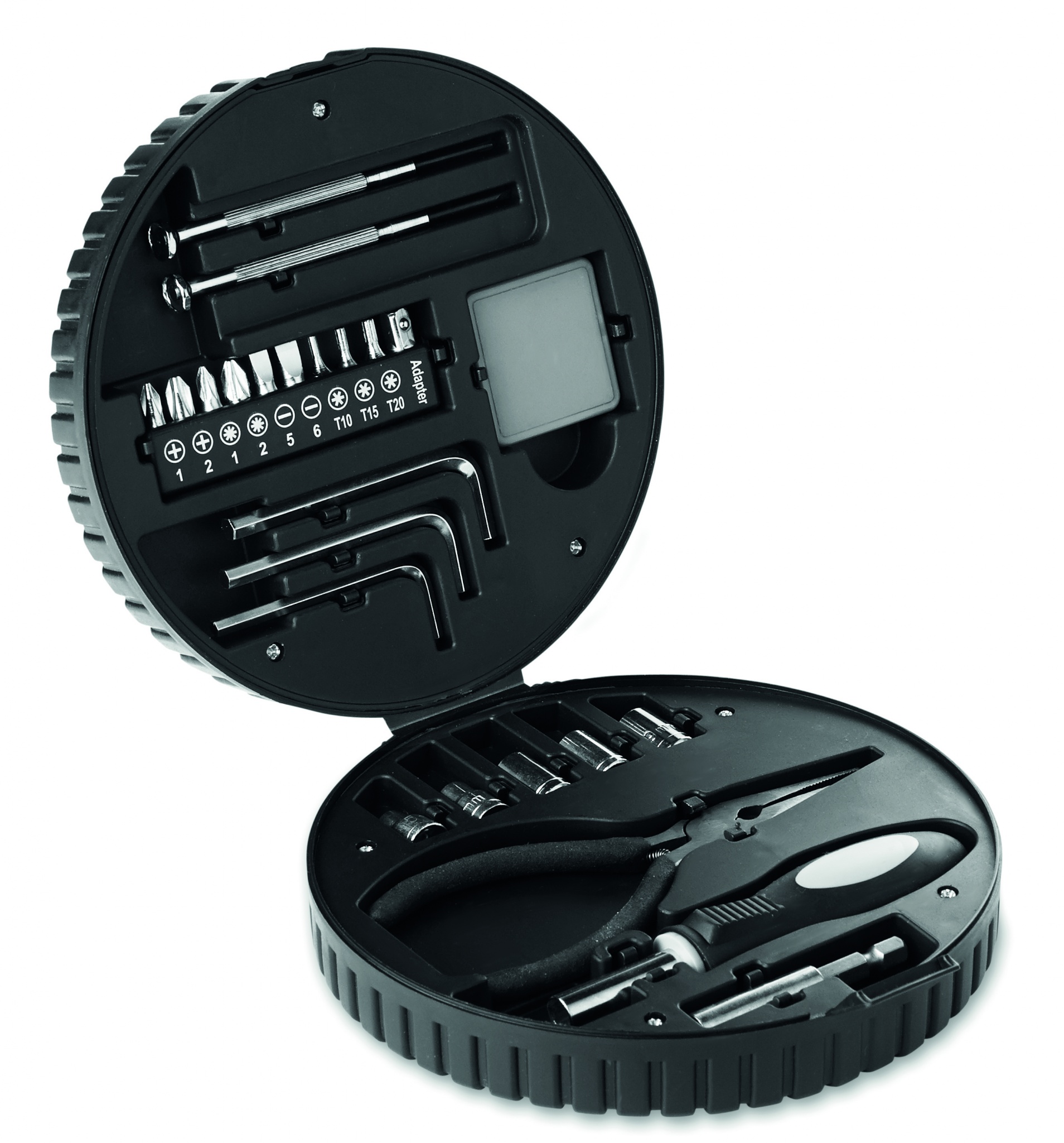 Verktygssats till bilen i 25 delar som ligger i en däckformad låda. Innehåller: 1 st förlängare, 1 st skruvmejselhandtag, 1 st Tång, 5 st hylsor, 3 st insexnycklar, 10 bits, 2 st precisions skruvmejslar och 1 band.
