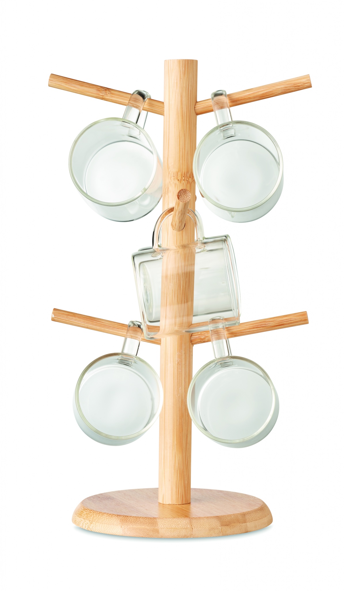 Ställning av bambu med 6 koppar av borosilikatglas. Denna dekorativa mugghållare ger ditt kök ett naturligt och snyggt utseende. Hänga de 6 medföljande glaskopparna på stativet. Kopparna är gjorda av borosilikatglas så de är perfekta för varma dryck som te.x. kaffe, te eller varm choklad. Varje kopp har en kapacitet på 200 ml. Kommer omonterad. Bambu är ett naturligt material, så det kan finnas små variationer i färg och storlek per artikel, vilket kan påverka det slutliga märkresultatet.