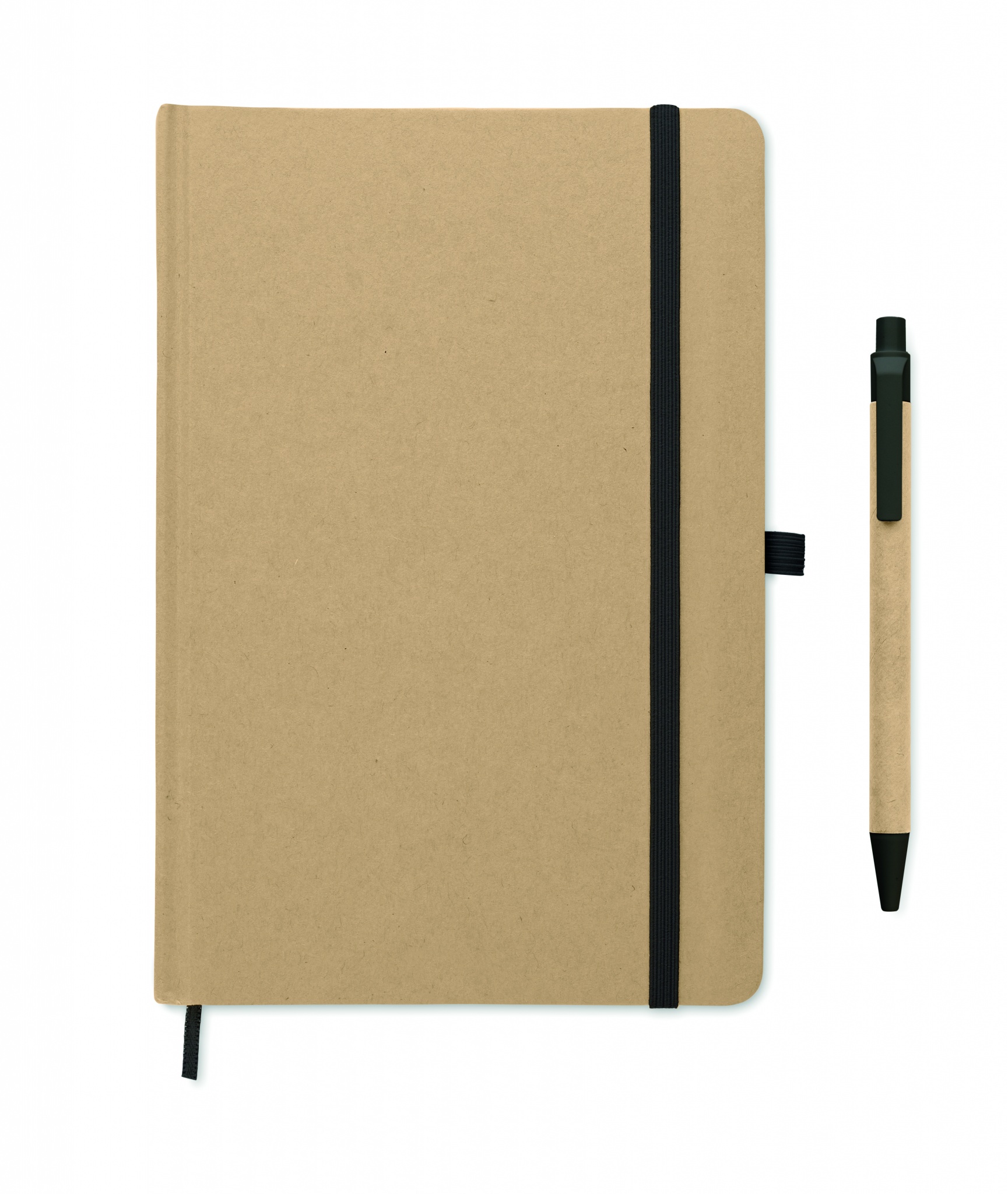 A5 anteckningsbok med omslag av hård återvunnen kartong. Inbunden med 160 linjerade sidor (80 ark återvunnet papper). Elastisk stängsningsband och pennhållare, sidomarkeringsband. Inklusive penna med kropp av återvunnet papper. Blått bläck