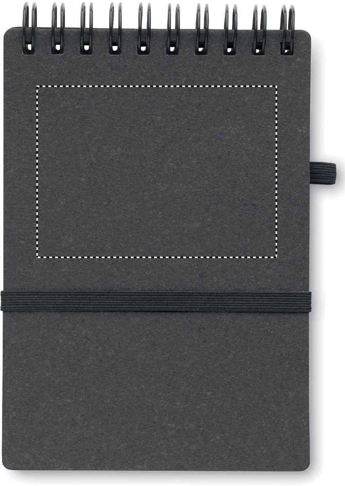 Anteckningsblock med omslag av återvunnet papper och PU (70% återvunnet papper och 30% PU). Ringbunden. 140 linjerade sidor av återvunnet papper (70 ark). Matchande penna i återvunnen kartong och ABS-delar. Blått bläck. Elastiskt stängningsband och pennhållare.