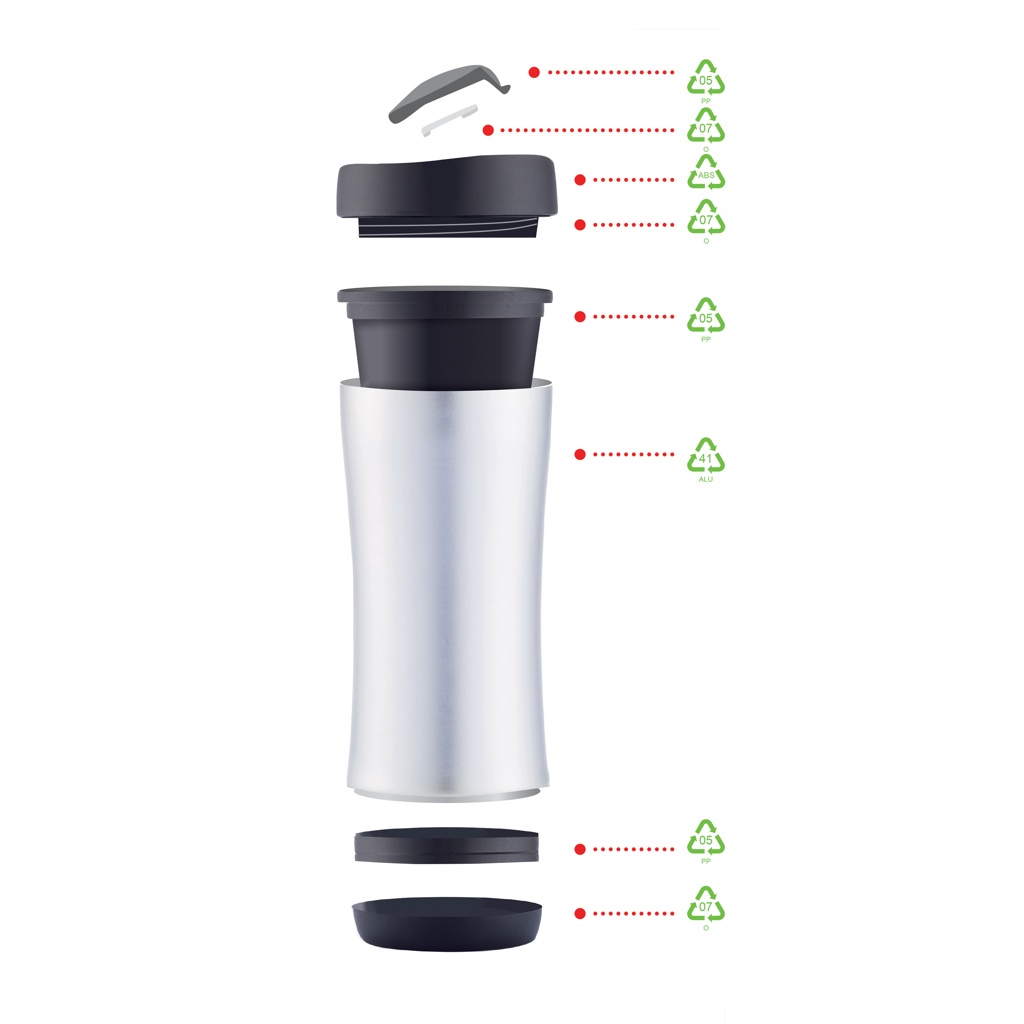 Placera ditt varumärke på en hållbar produkt, som tar ansvar. Boom håller koll på din dryck, 225 ml, tät stängning och dubbelvägg om du lovar att hålla koll på hur den återvinns. Vid slutet på muggens livslängd så kan du demontera ned hela muggen, plast för plaståtervinning och metall för metallåtervinning etc. Registrerad design®