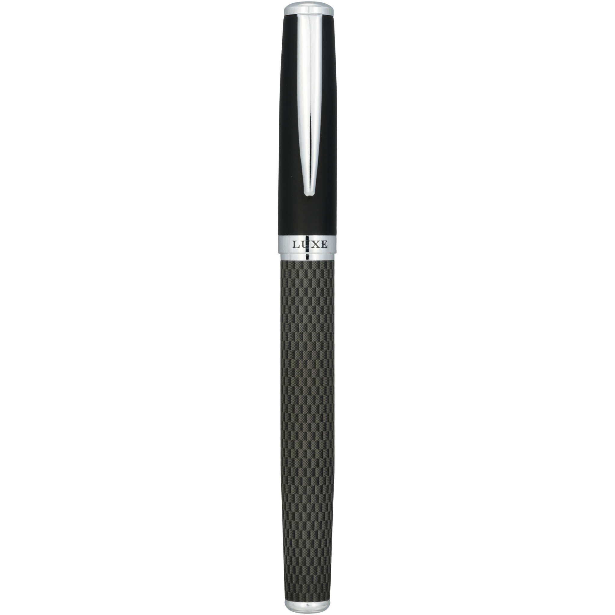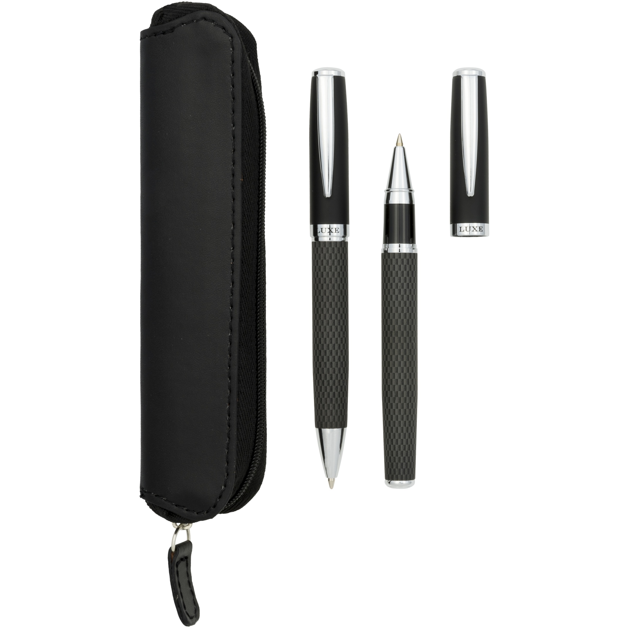 Carbon presentset med två kulspetspennor i fodral. För en något annorlunda svart framtoning är dessa kulspets- och bläckpennor exklusivt designade i tryckt kolfiber. Inklusive skyddande påse i finaste kvalitet, packad i en "LUXE" presentförpackning. Metall.