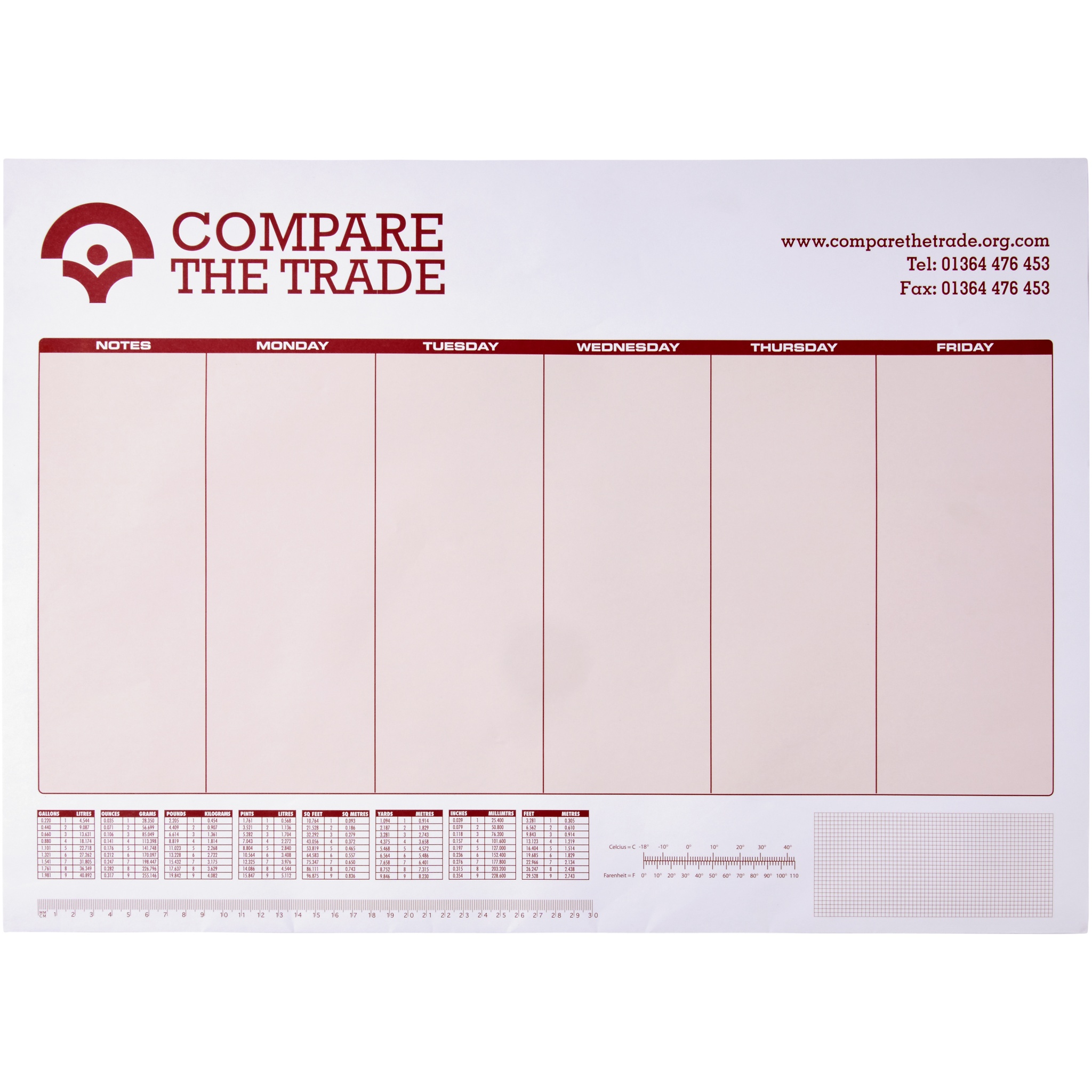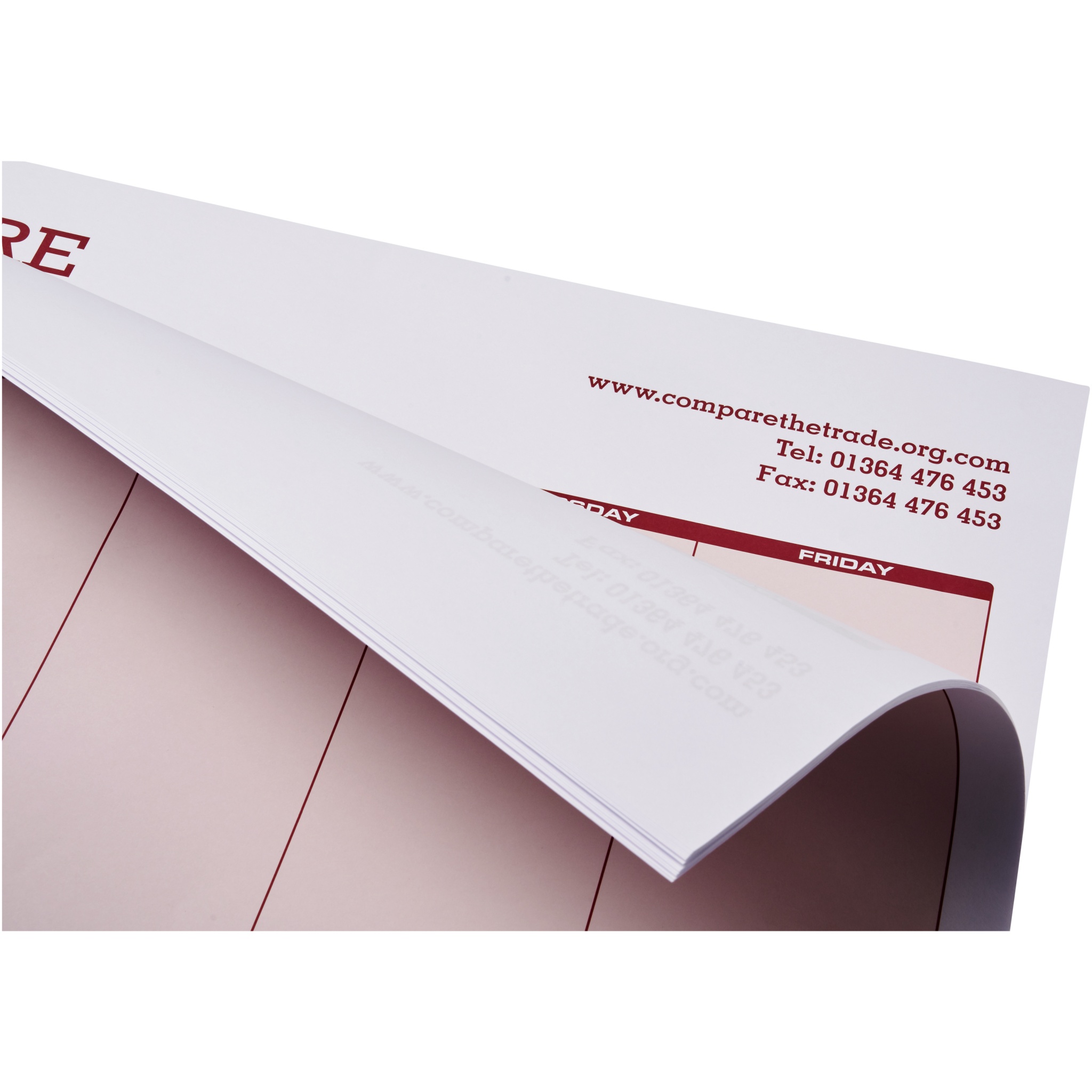 Vit A3 Desk-Mate® anteckningsblock. Standardmodell Innehåller 50 ark 80 g / m2 papper. Fullfärgstryck tillgängligt för varje ark. Tre storlekar tillgängliga: 25/50/100 ark.