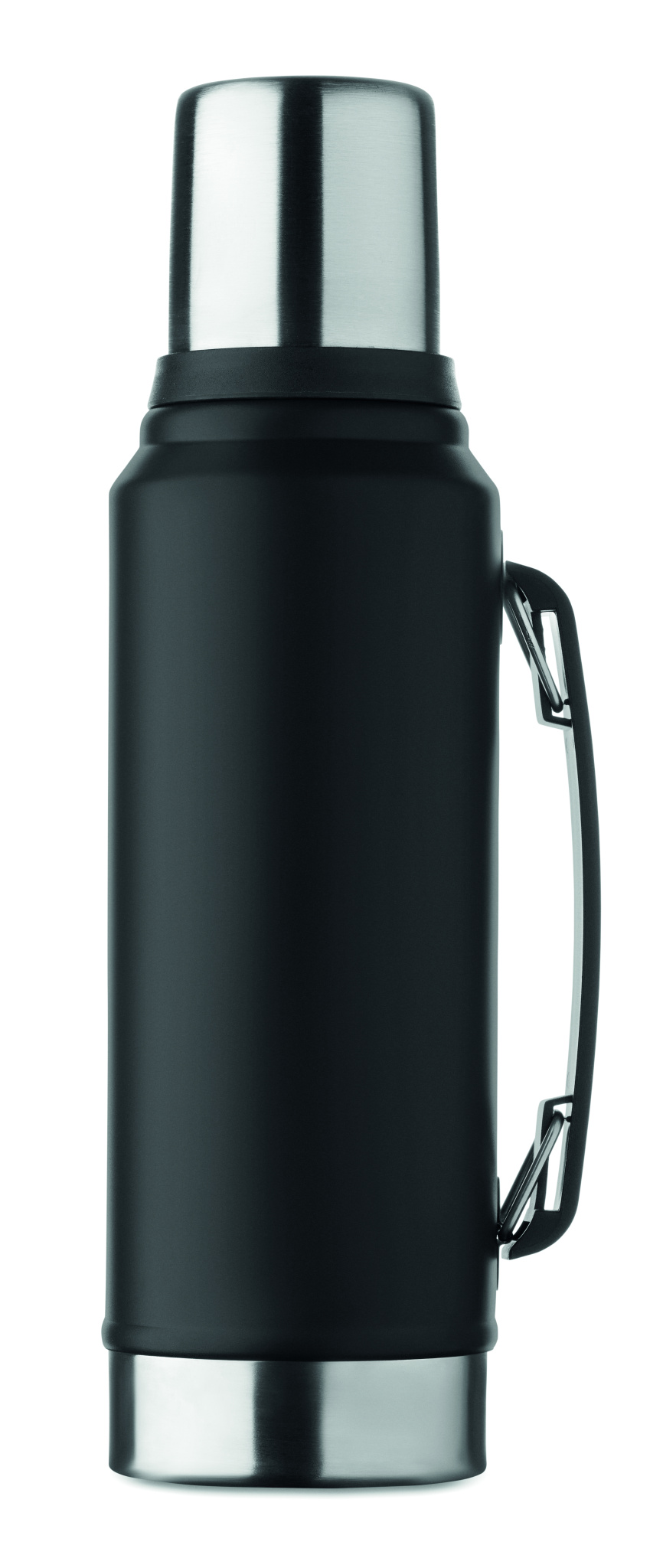 Dubbelväggig vakuumisolerande flaska i återvunnet rostfritt stål (90% återvunnet rostfritt stål och 10% rostfritt stål) med handtag på sidan. Lock i PP och mugg i återvunnet rostfritt stål. Läckagefri. Volym: 1L.