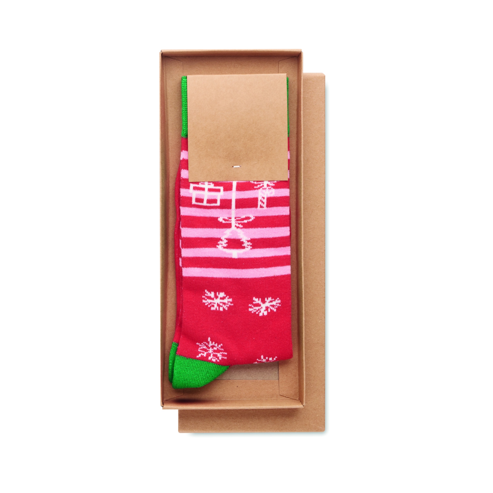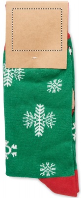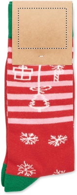 Ett par julstrumpor i 75 % bomull, 23 % RPET polyester och 2 % spandex. Levereras i presentask. Storlek M = 38-42.