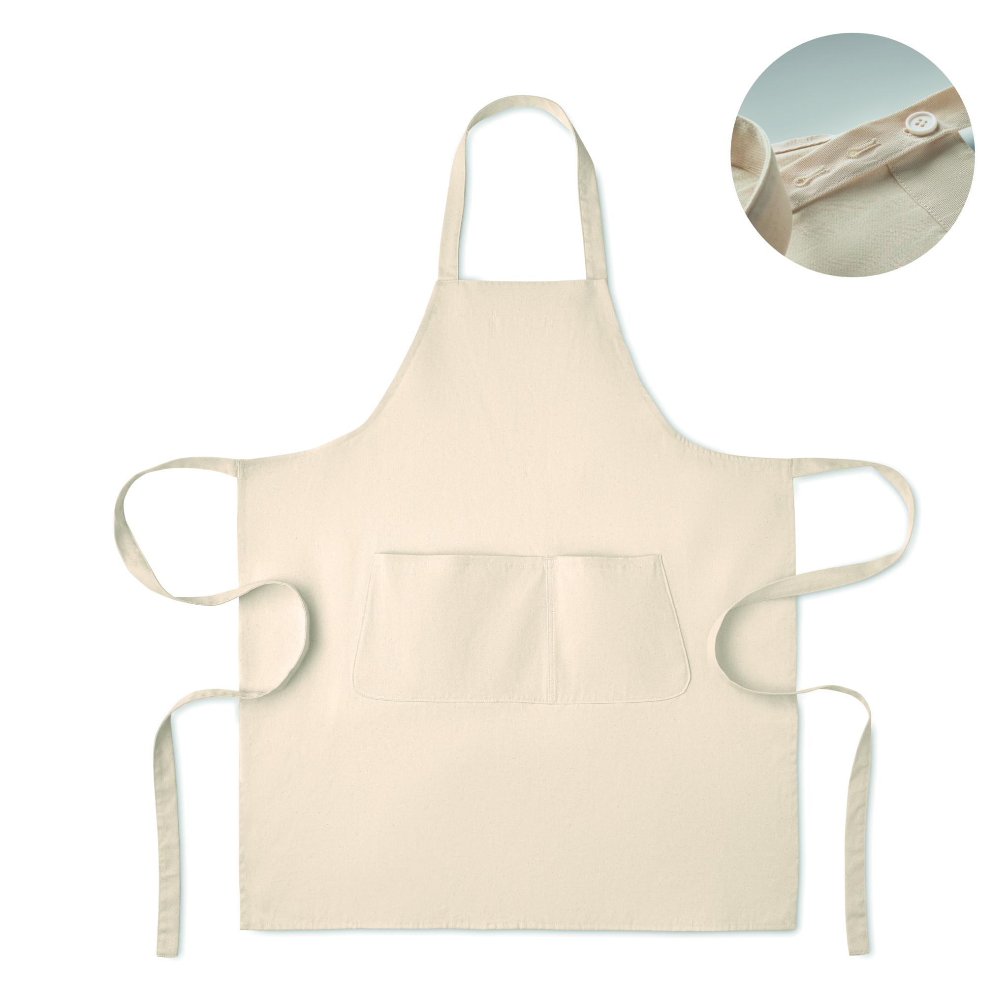 Justerbart förkläde med 1 stor framficka med 2 fack i 240 gr/m² ekologisk bomull. Med justerbar knapp på halsremmen. Denna produkt är certifierad enligt OEKO-TEX® STANDARD 100.