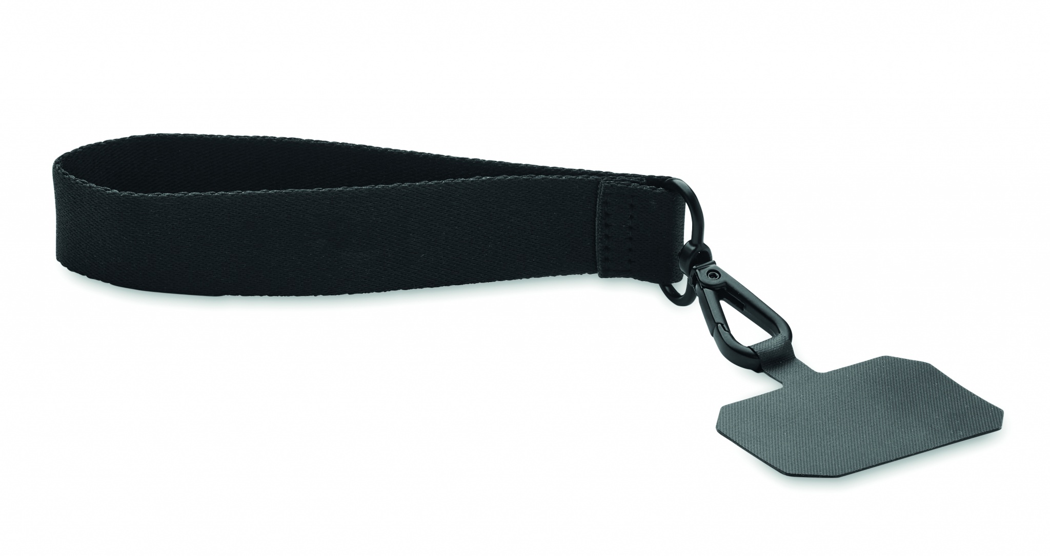 Telefonhållare i polyester med handledsrem och säkerhetsspänne. 2,5 cm.