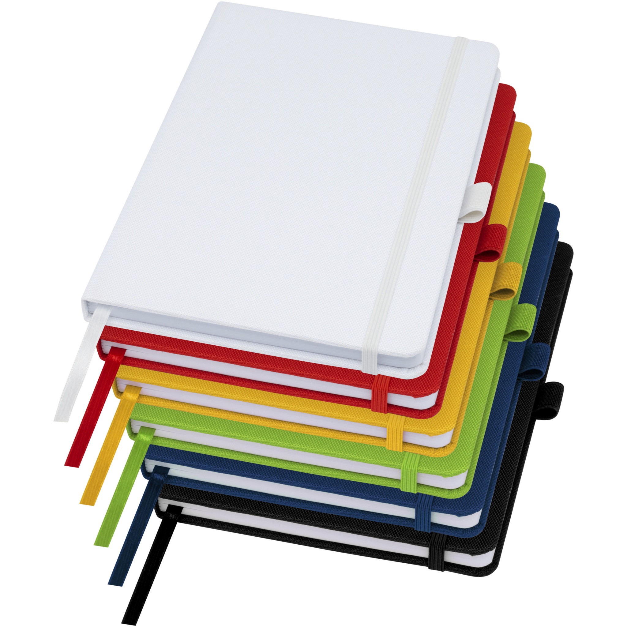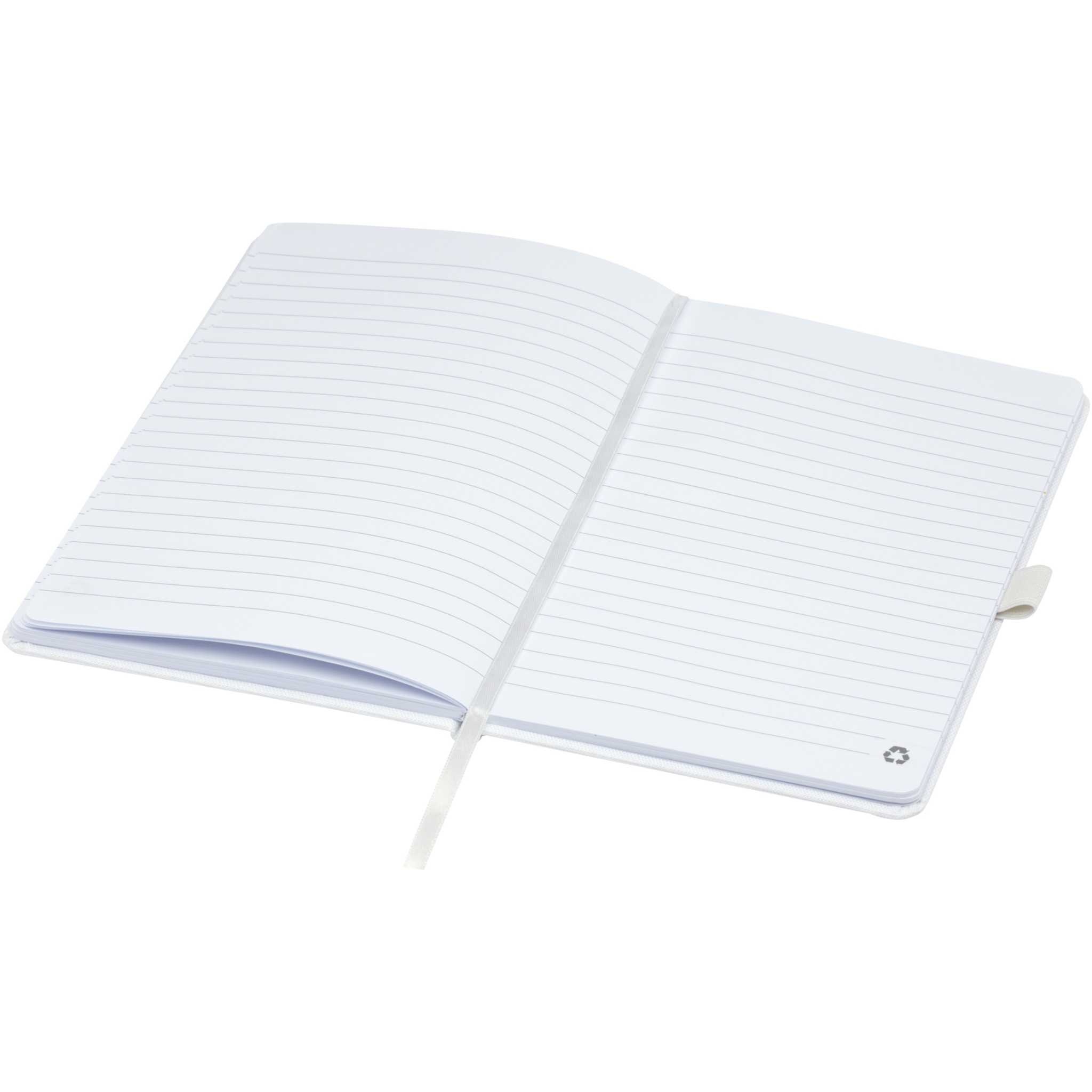 A5 anteckningsbok med cover av RPET tyg. Innehåller 80 ark 70 g/m² återvunnet papper med fodrad layout, en pennslinga och bandmarkör. Kan kombineras med 107757 Honua RPET kulspetspenna.