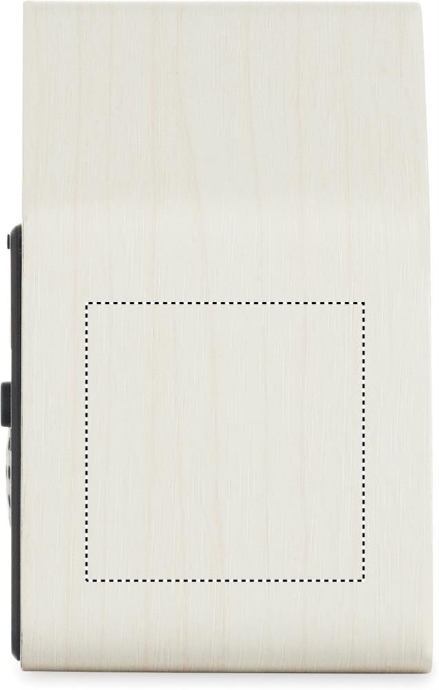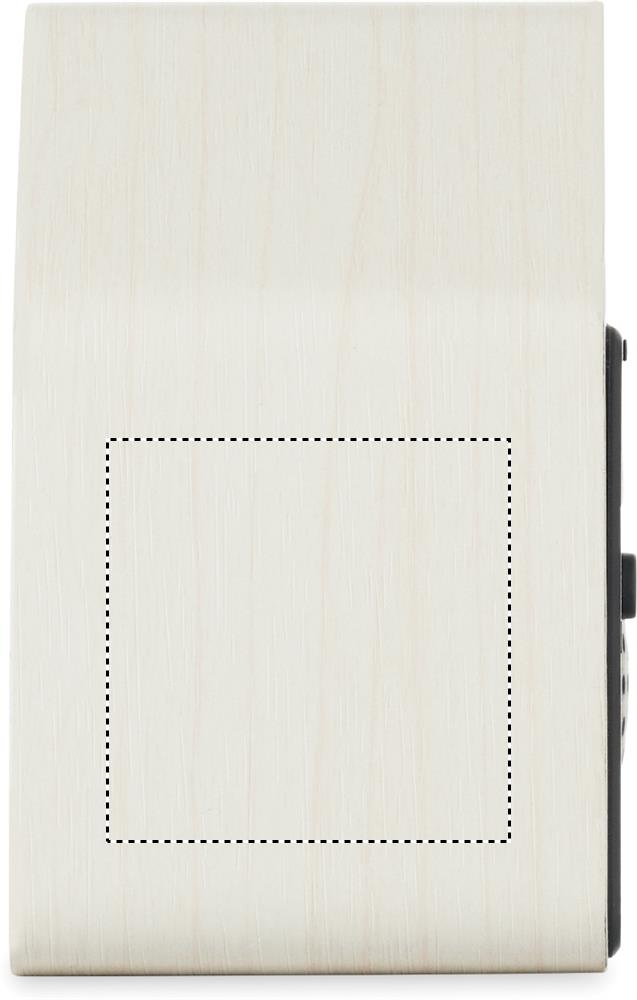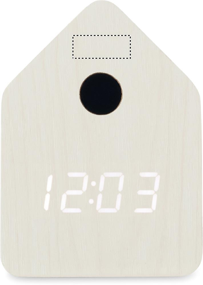 Liten bordsklocka i MDF med inbyggt alarm med fågelgökröst och temperaturvisning. Vit LED-display. Ljudet tystnar automatiskt mellan 22.00h och 06.00h. 5 minuters snooze-intervaller
