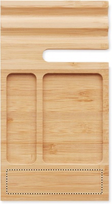 Bordsställ i bambu med ställ för telefon och gem samt anteckningslappar.