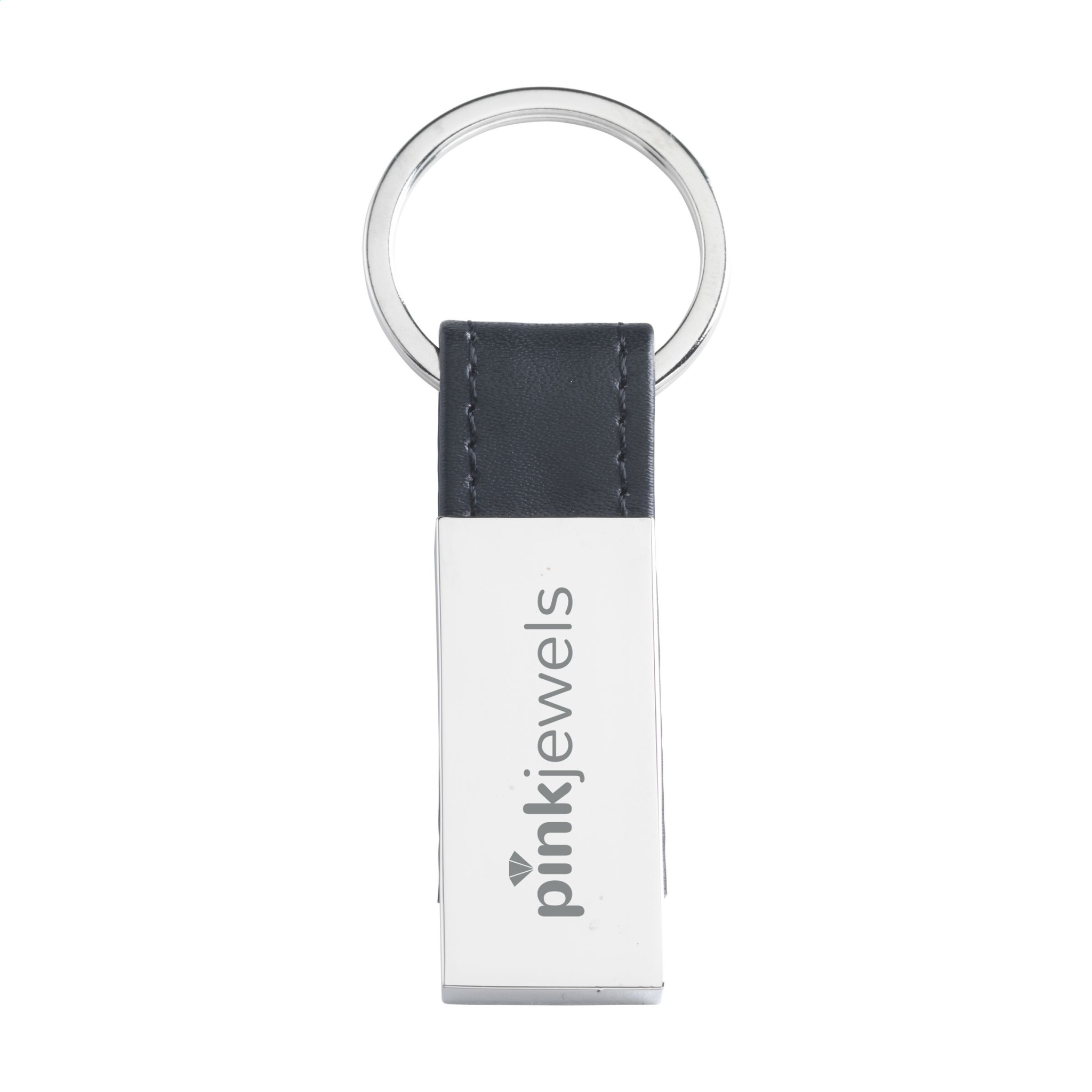 Nyckelring i metall kombinerat med material i svart PU-läderlook. På kraftig nyckelring. Varje artikel är individuellt förpackad.