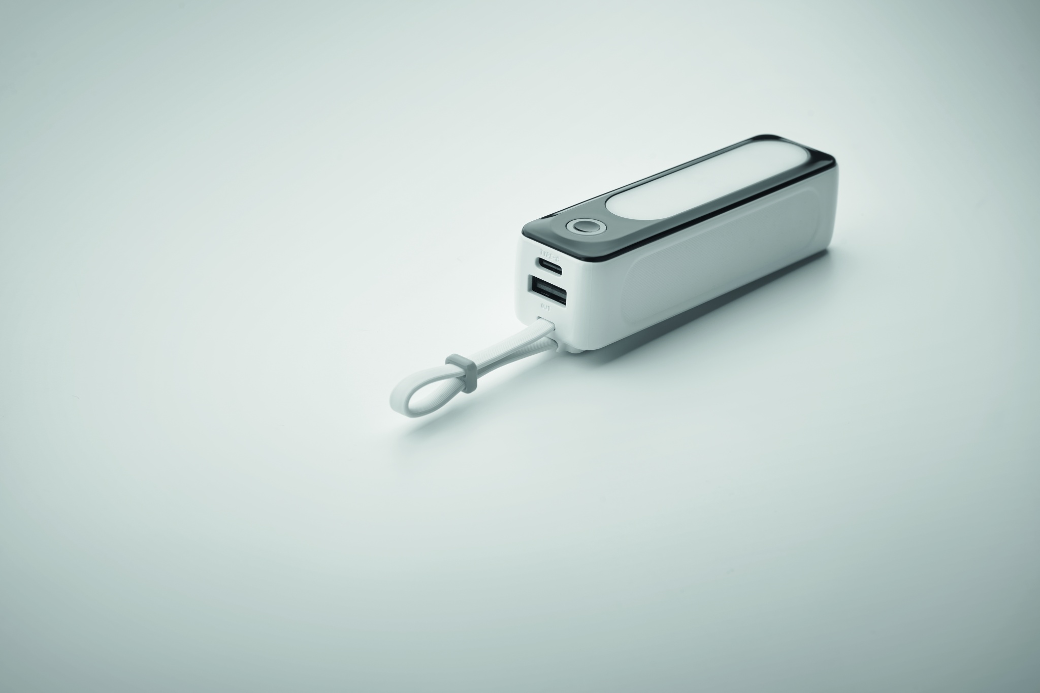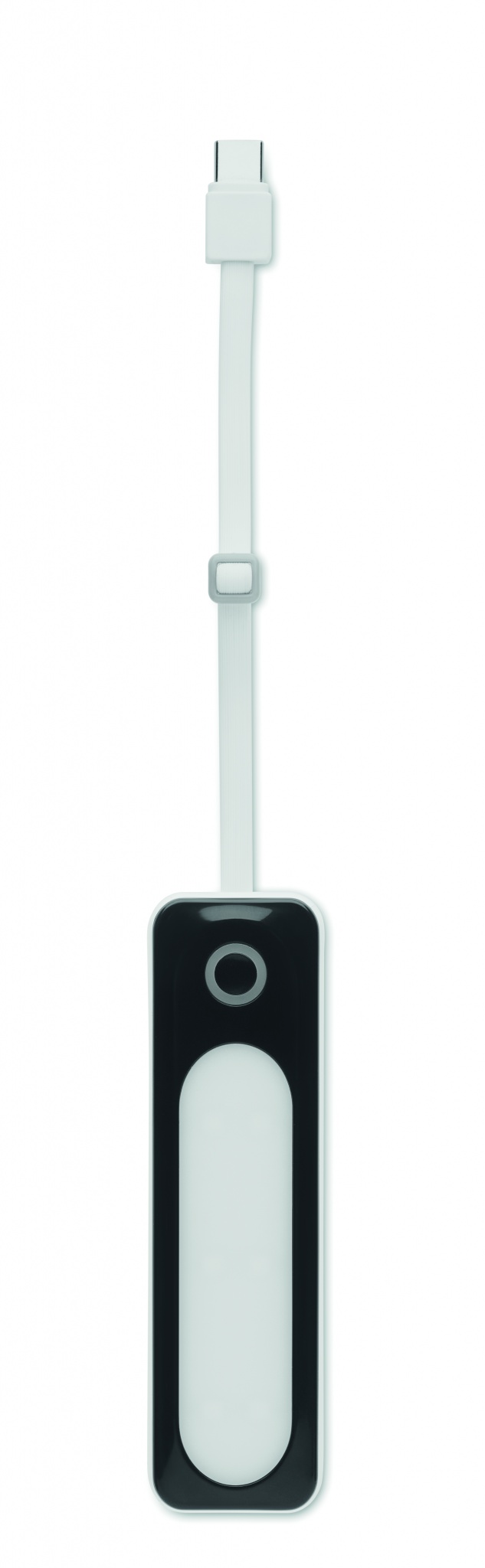Powerbank 5000 mAh kapacitet i ABS-hölje. Utgångsström DC5V/2A. Inkluderar indikering med 4 ljusinställningar (6 COB led) och integrerad USB-kabel med typ C-kontakt.