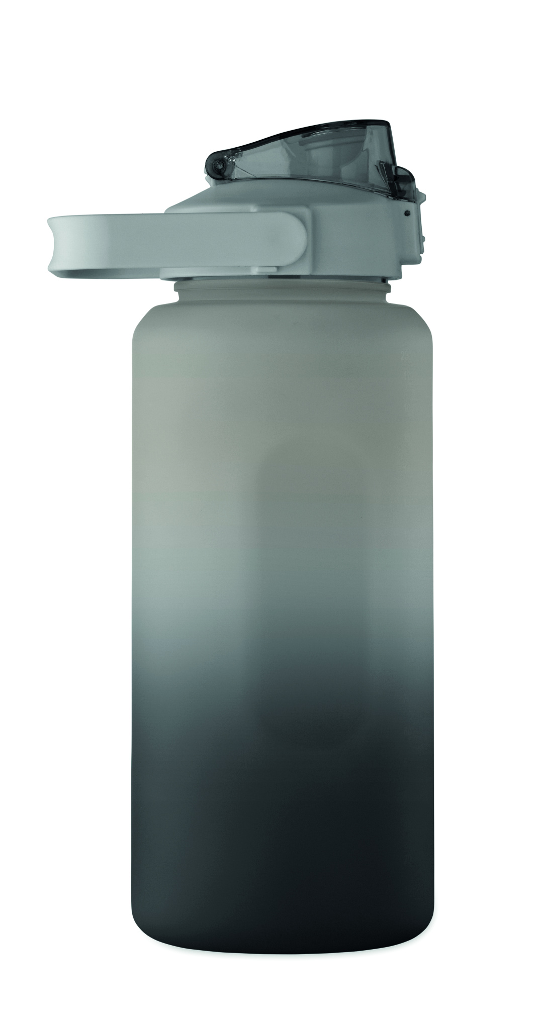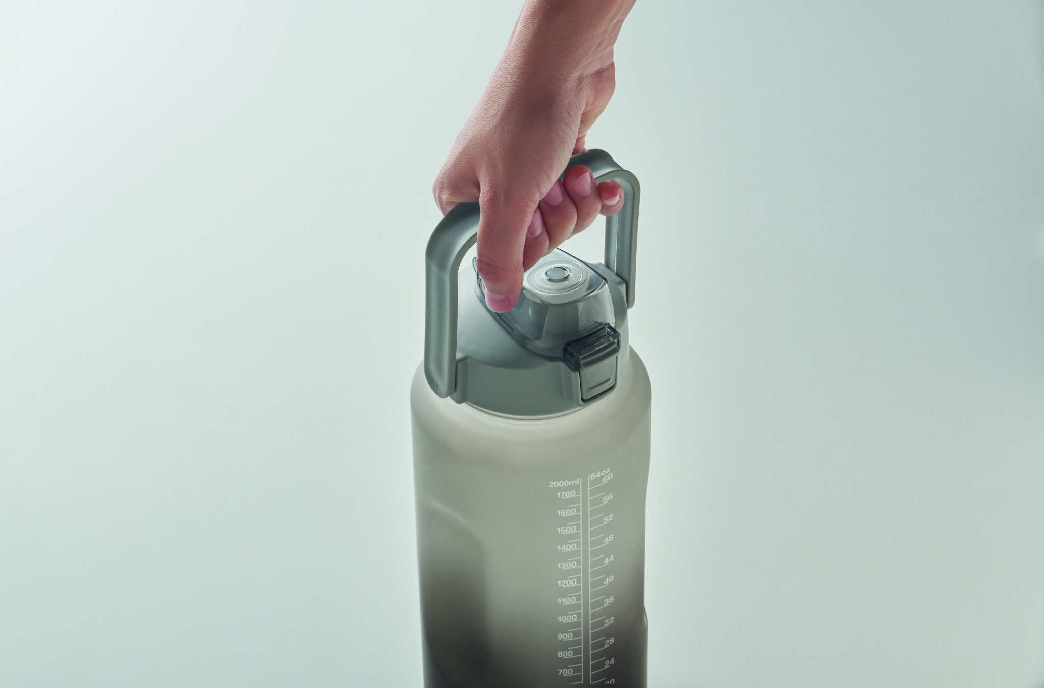 Motiverande vattenflaska i RPET. Med enhandsöppning, flip-top-lock med sugrör, säkerhetslås och handtag. Läckagefri. Volym: 2000 ml