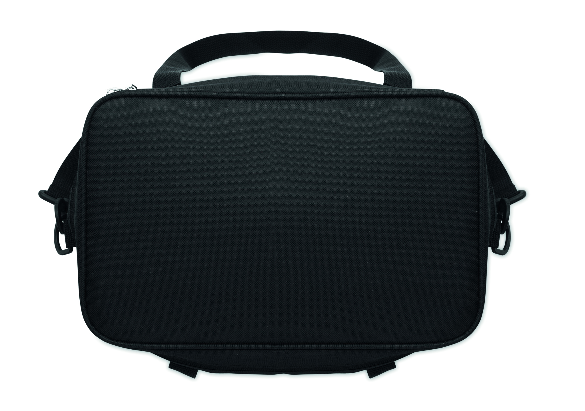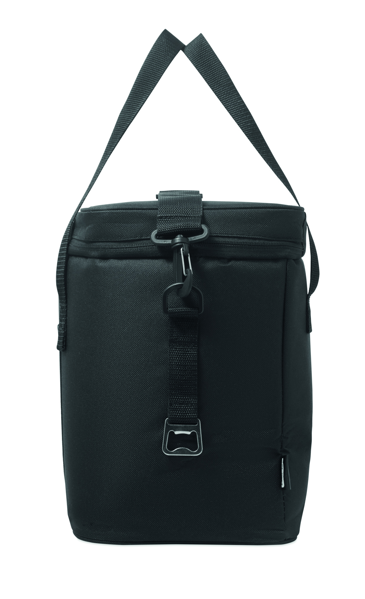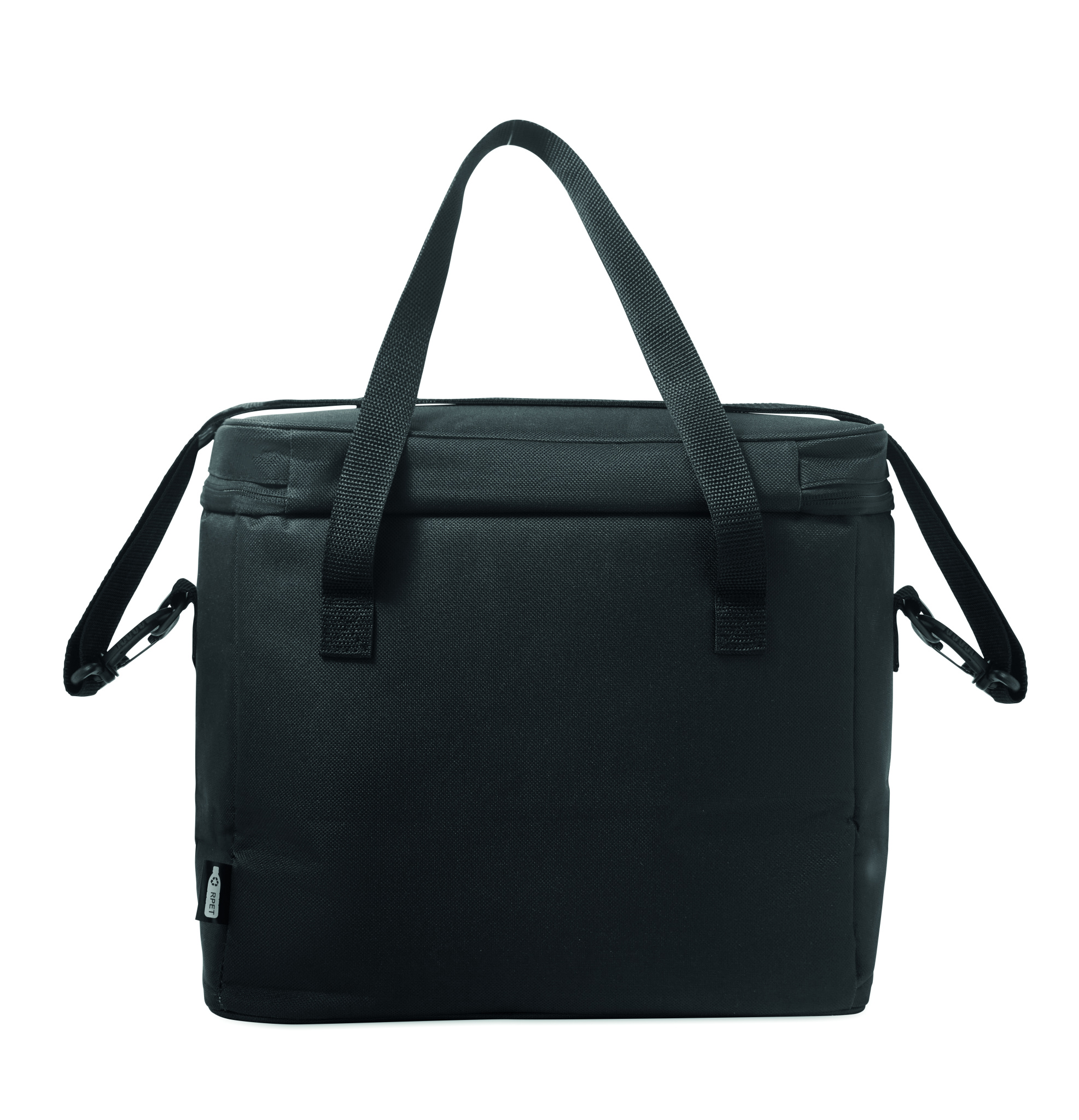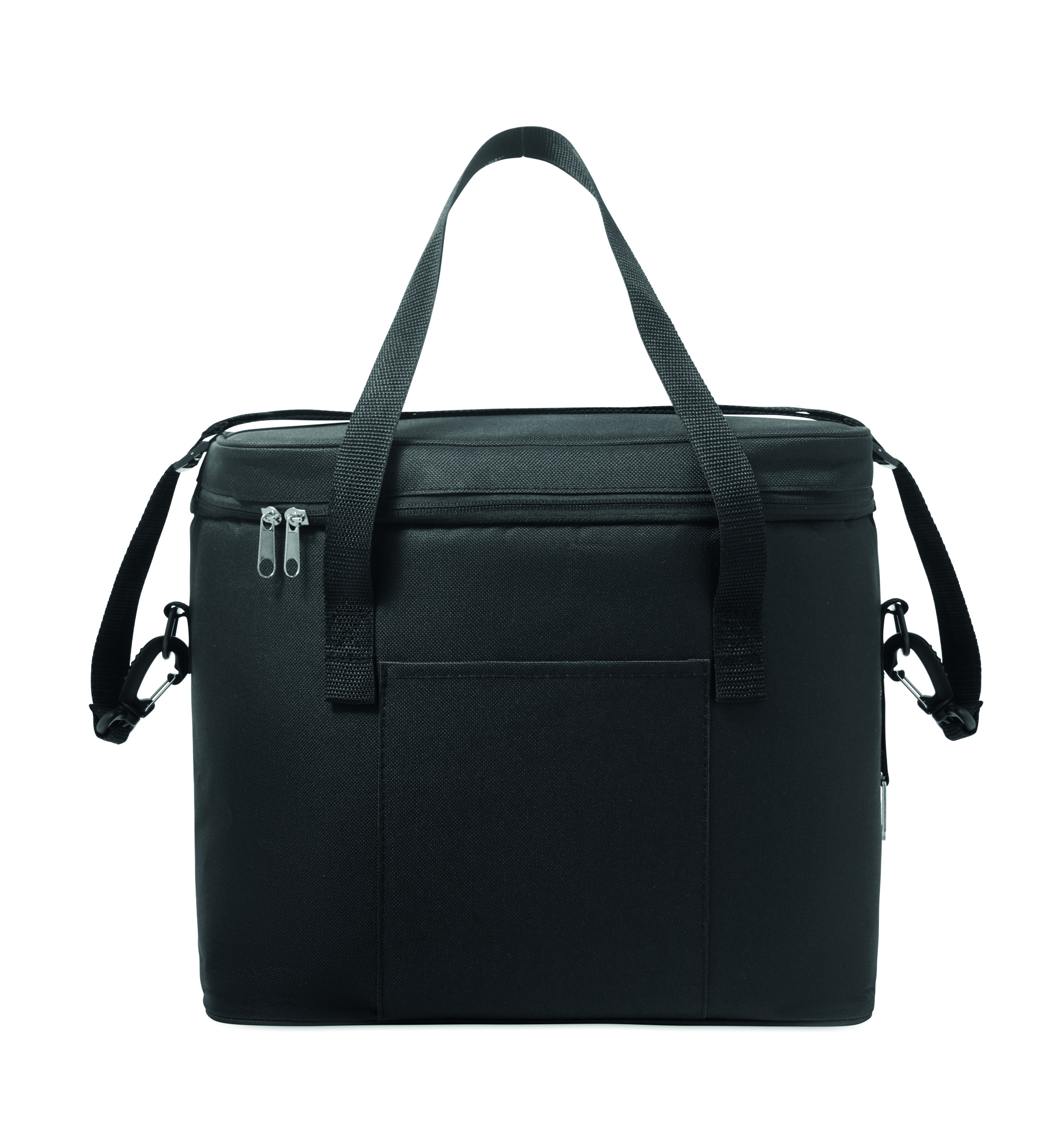 Kylväska i 600D RPET-polyester med PU-beläggning. Inklusive 1 frontficka och 1 inre nätficka. Isolerande PEVA-foder med 6 mm PE-skum. Inklusive 2 handtag och 1 justerbar axelrem. Volym: