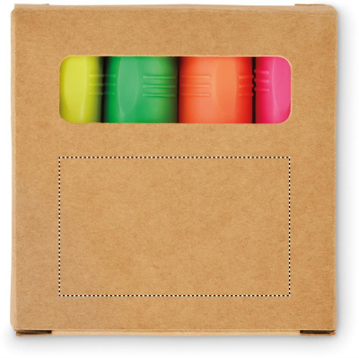 Set med 4 överstrykningspennor i en kraftlåda. Färgerna gul, grön, orange och cerise.