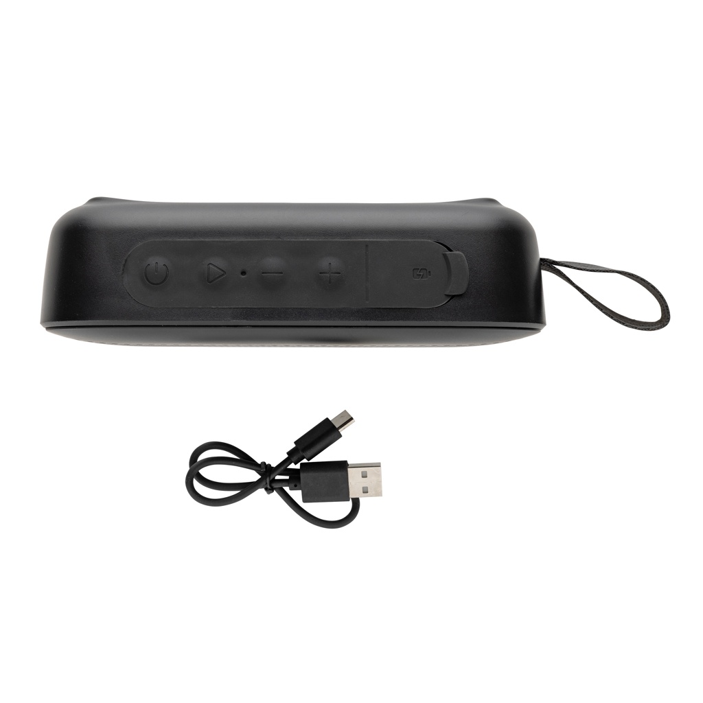 5W trådlös högtalare tillverkad av RCS-certifierad återvunnen ABS (Recycled Claim Standard). Totalt återvunnet innehåll: 36% baserat på total produktvikt. RCS-certifiering garanterar en helt certifierad leveranskedja för de återvunna materialen. Högtalaren är utrustad med ett 1200mAh-batteri som garanterar upp till 6 timmars speltid. Med BT5.3 för smidig anslutning och klart ljud. Räckvidd upp till 10 meter. Med mikrofon för att svara på samtal. Levereras i en FSC®-mixförpackning. Laddningskabel i RCS-certifierad återvunnen TPE medföljer. Produkten och tillbehören är 100% PVC-fria. IPX 5 vattentät.