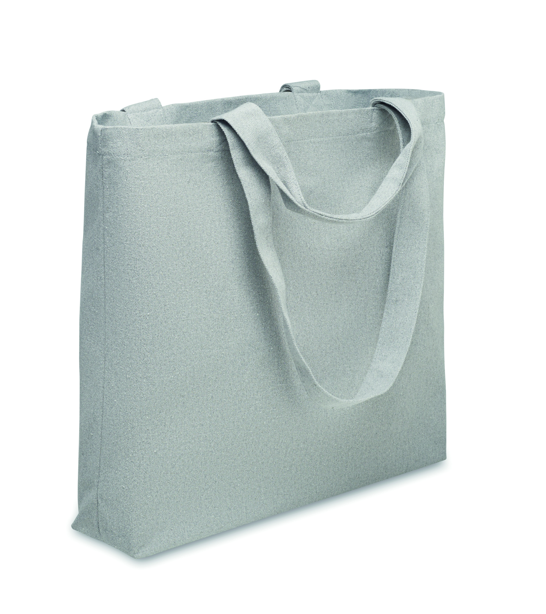 Kasse-/strandväska i återvunnet tyg (60% återvunnen bomull, 40% återvunnen polyester) med korta och långa handtag. 320 gr/m².