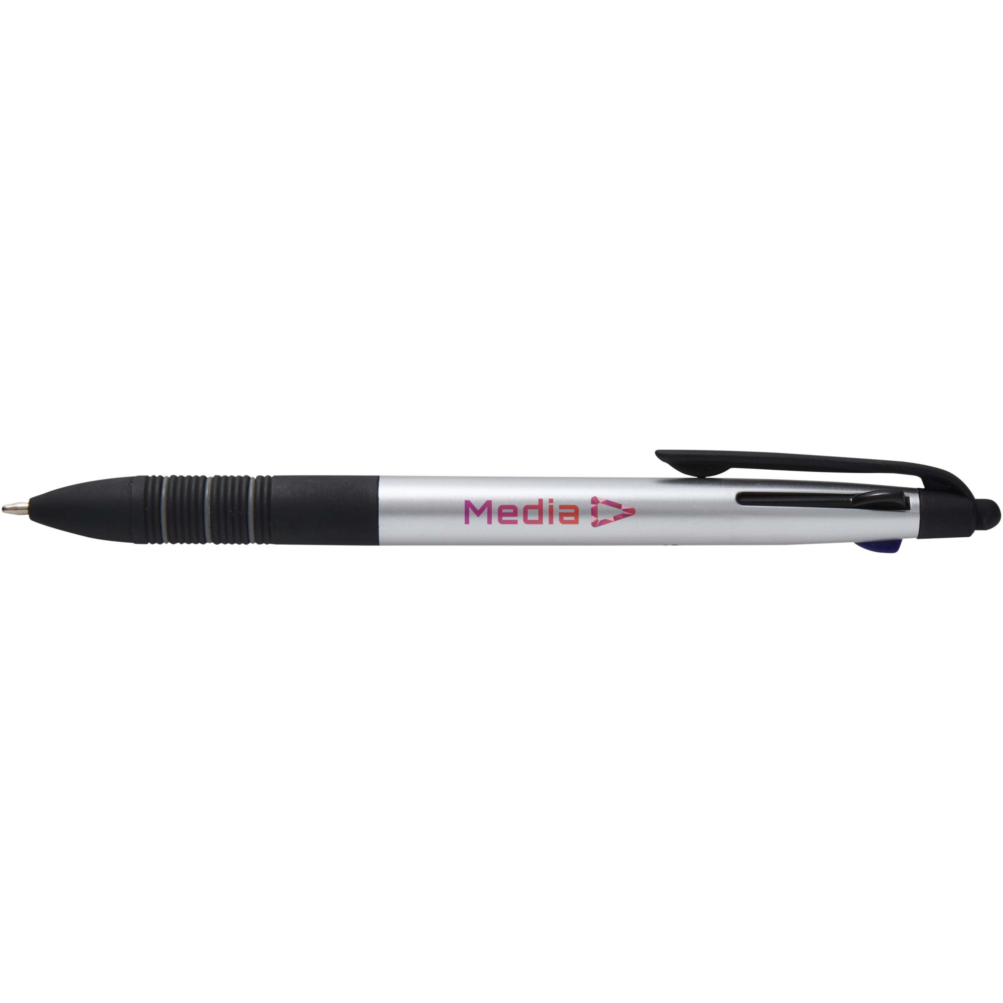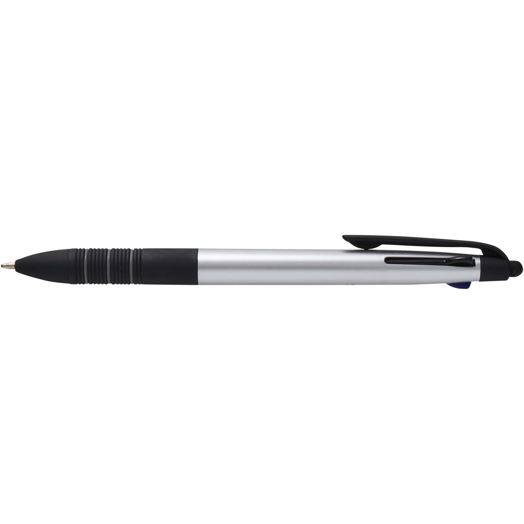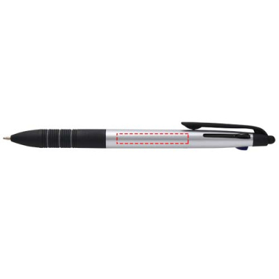 3-i-1 kulspetspennan Trine är ett mångsidigt skrivverktyg tillverkat av RCS-certifierad ABS-plast med en modern metallfinish och en integrerad stylusspets för användning på pekskärm. Den har en tryck- och skjutmekanism som gör det enkelt att växla mellan svart, blått och rött bläck. Det ergonomiska greppet med svart halkskyddande gummi och grå ringdetaljer gör hanteringen bekväm. Den kompakta och funktionella pennan Trine är idealisk för varumärkesprofilering, och är perfekt för anteckningar, presentationer eller digitala interaktioner.